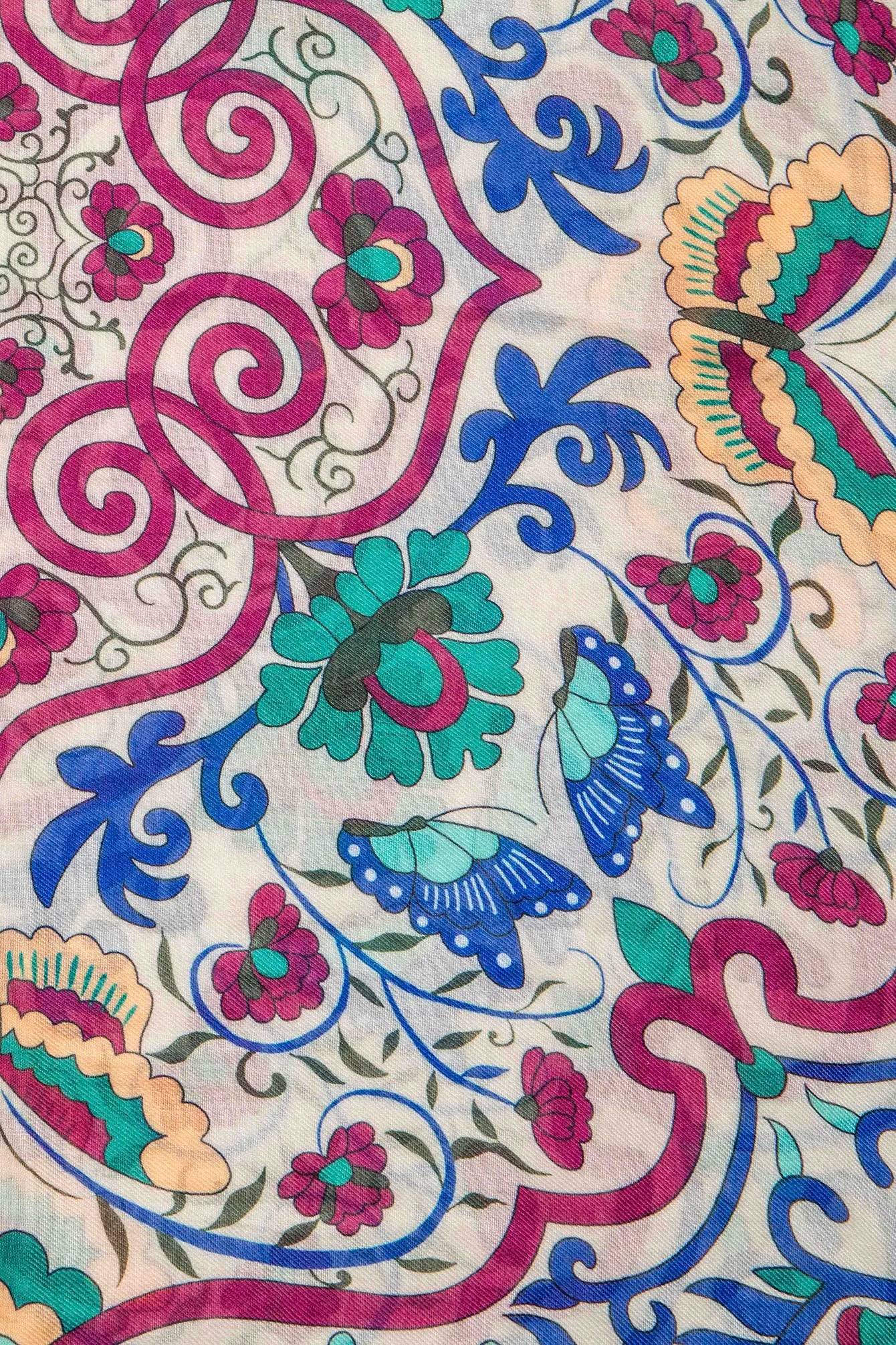 Le chèche en voile vaporeux et l'imprimé floral multico façon dyptique.