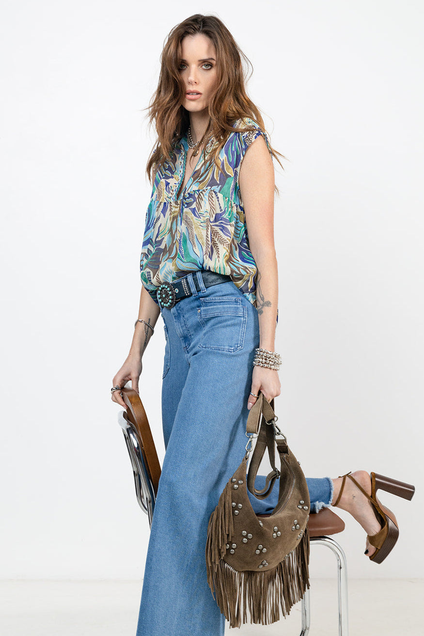Ce jean large bleu clair allonge la silhouette grâce à sa taille haute et son bas frangé, signature d’un style moderne. Dans l’univers Elora, il se distingue par son confort sans couture côté et sa coupe fluide. Lumineux et facile à porter, il devient un essentiel pour des looks actuels et effortless.