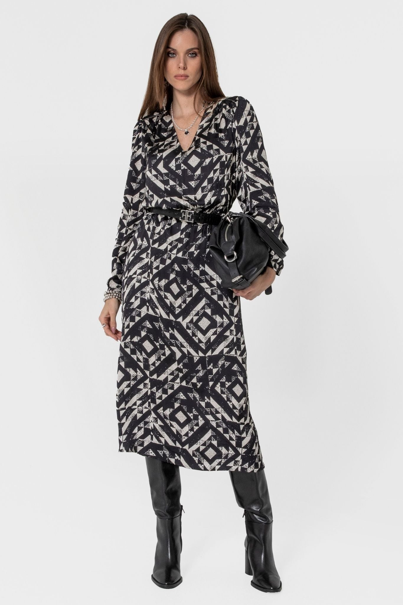 L'imprimé graphique en noir et blanc, le tissu soyeux et les incrustations de chainettes aux épaules, pour une robe à rocker d'un perfecto en cuir.