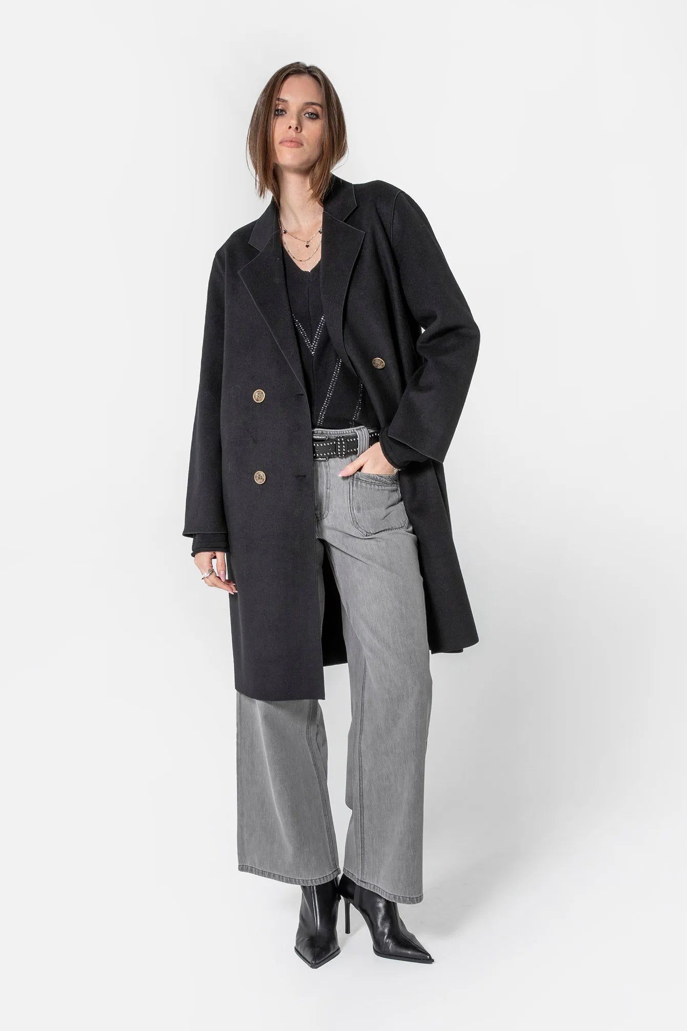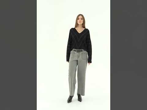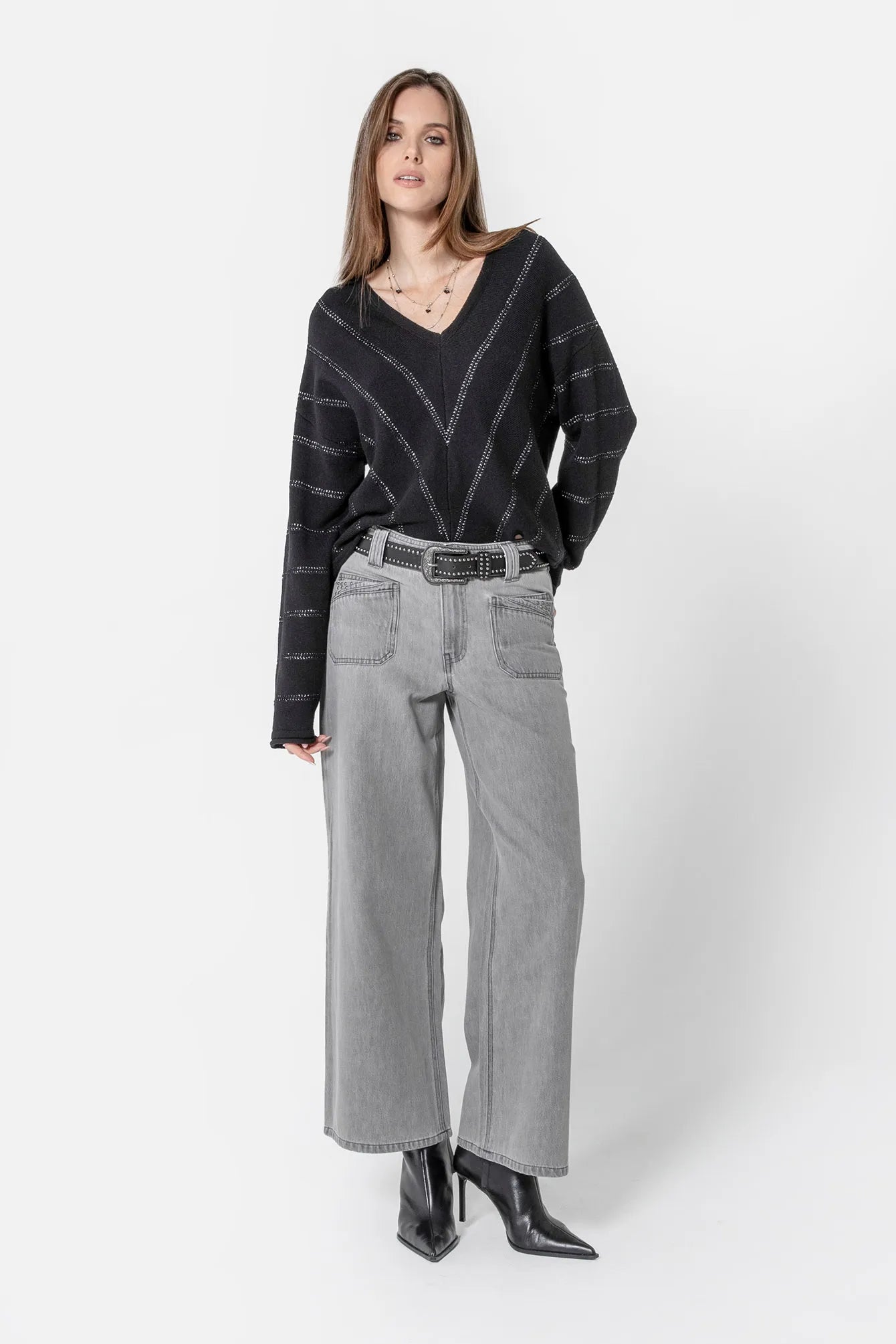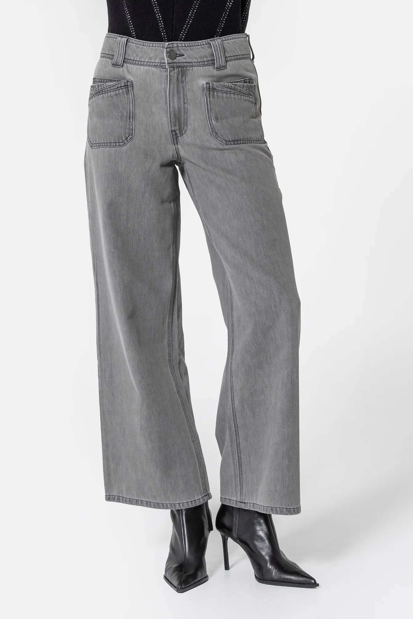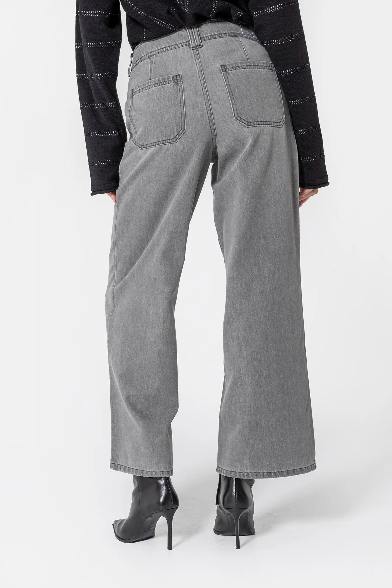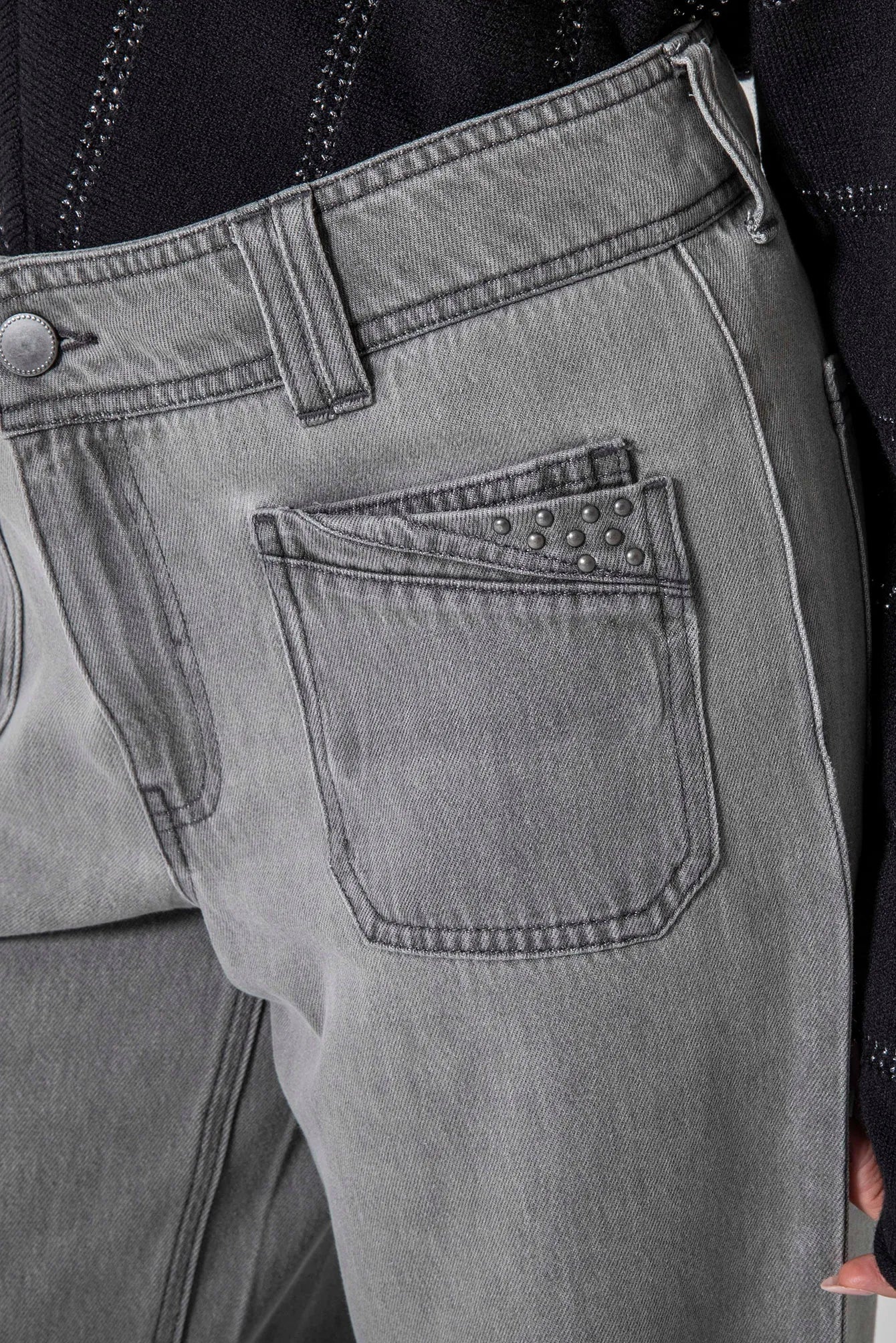 La coupe large et la texture souple et brillante du denim avec du lyocell. Le coloris gris et les clous aux poches lui apportent un petit supplément d'âme.