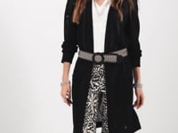 Ce gilet noir en maille filet affirme une allure gipsy élégante et structurante, imaginée par Elora pour sublimer les superpositions. Sa forme longue et droite accompagne la silhouette avec fluidité, tandis que les larges bandes décoratives apportent du caractère. Porté avec ou sans sa ceinture frangée, il permet de varier les styles selon l’envie. Les finitions soignées et la maille ajourée offrent légèreté et modernité. Une pièce forte, idéale pour donner du relief aux tenues du quotidien.