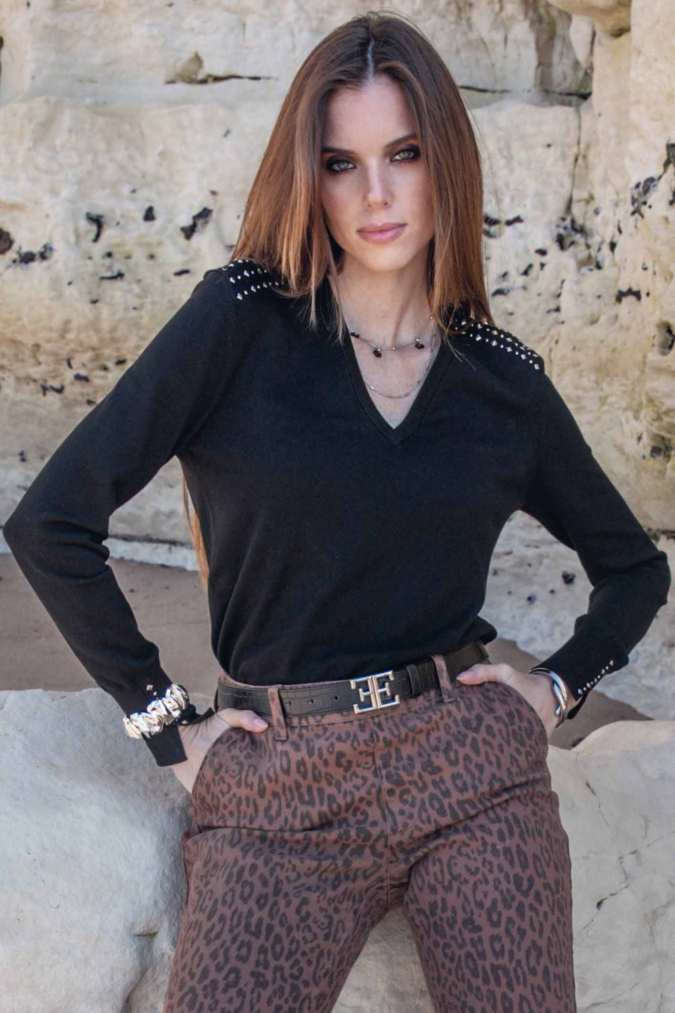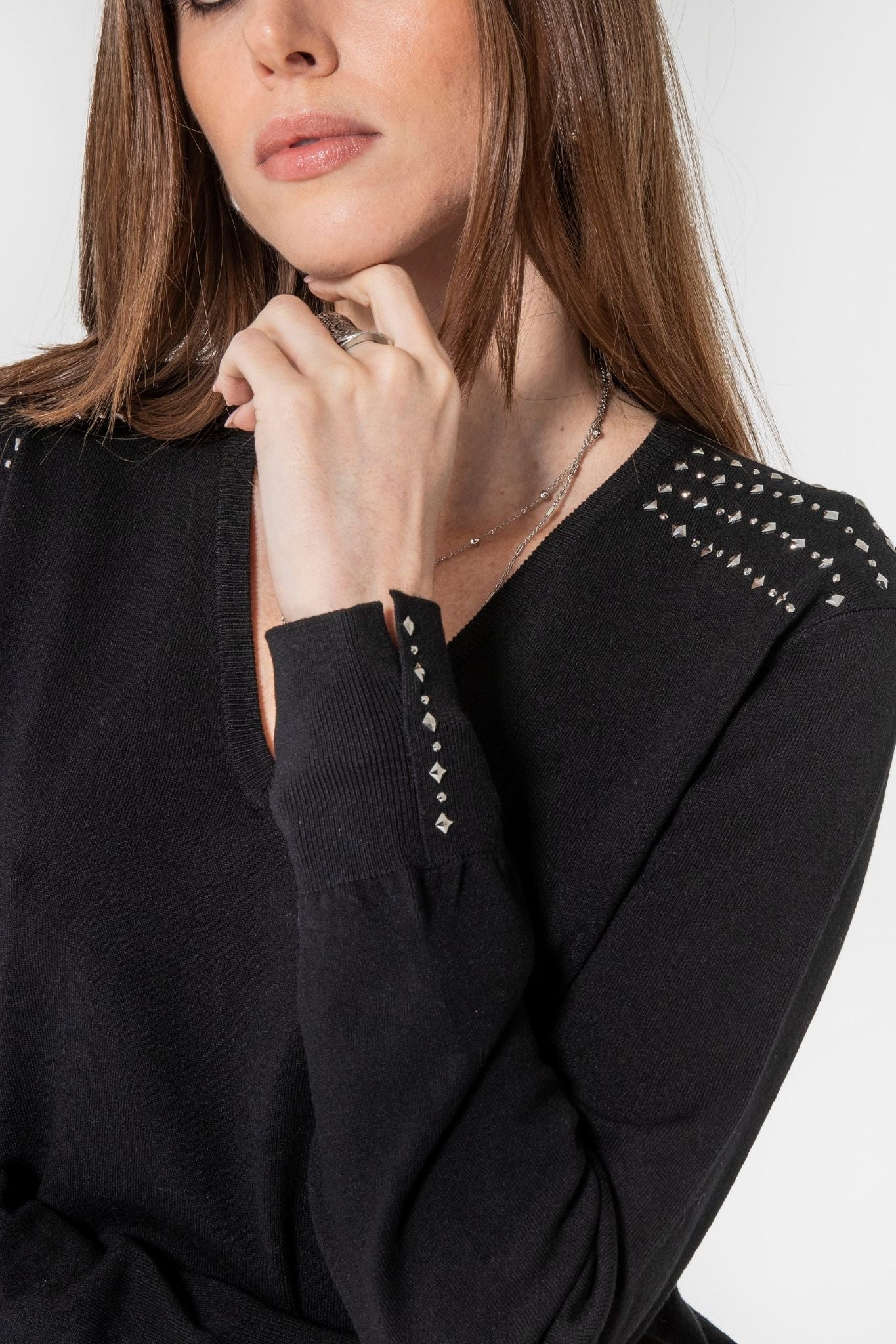 Le pull fin avec son petit supplément d'âme rock : clous à facettes ornant les épaules et les poignets, encolure V pour mettre en valeur le décolleté.