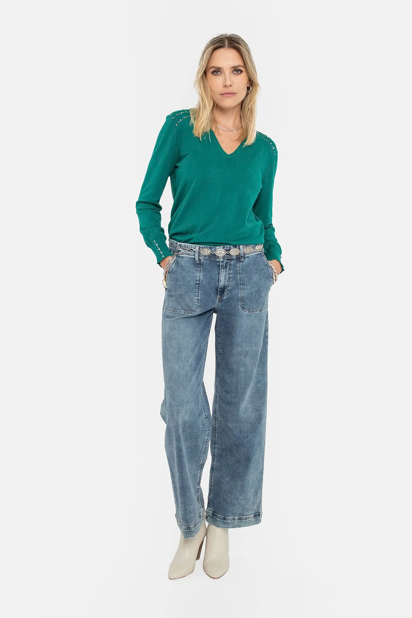 Le pull fin avec son petit supplément d'âme rock : clous à facettes ornant les épaules et les poignets, encolure V pour mettre en valeur le décolleté.
