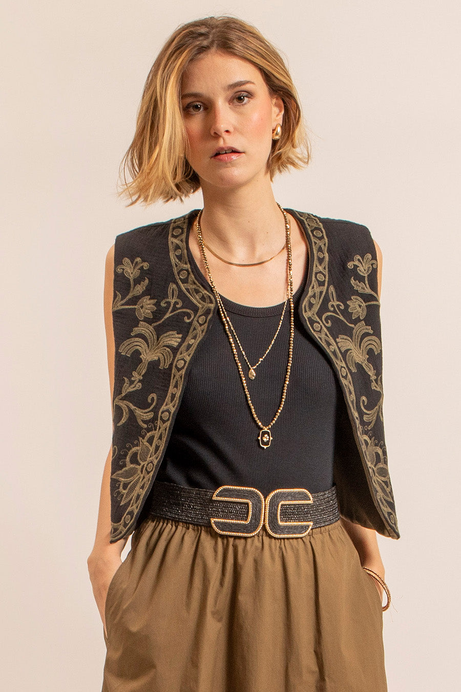 La pièce empruntée au dressing masculin pour une dégaine casual rock. Il s'accordera parfaitement sous toutes vos chemises, ou simplement avec un jean pour une allure effortless mais toujours féminine avec son motif dans le dos.