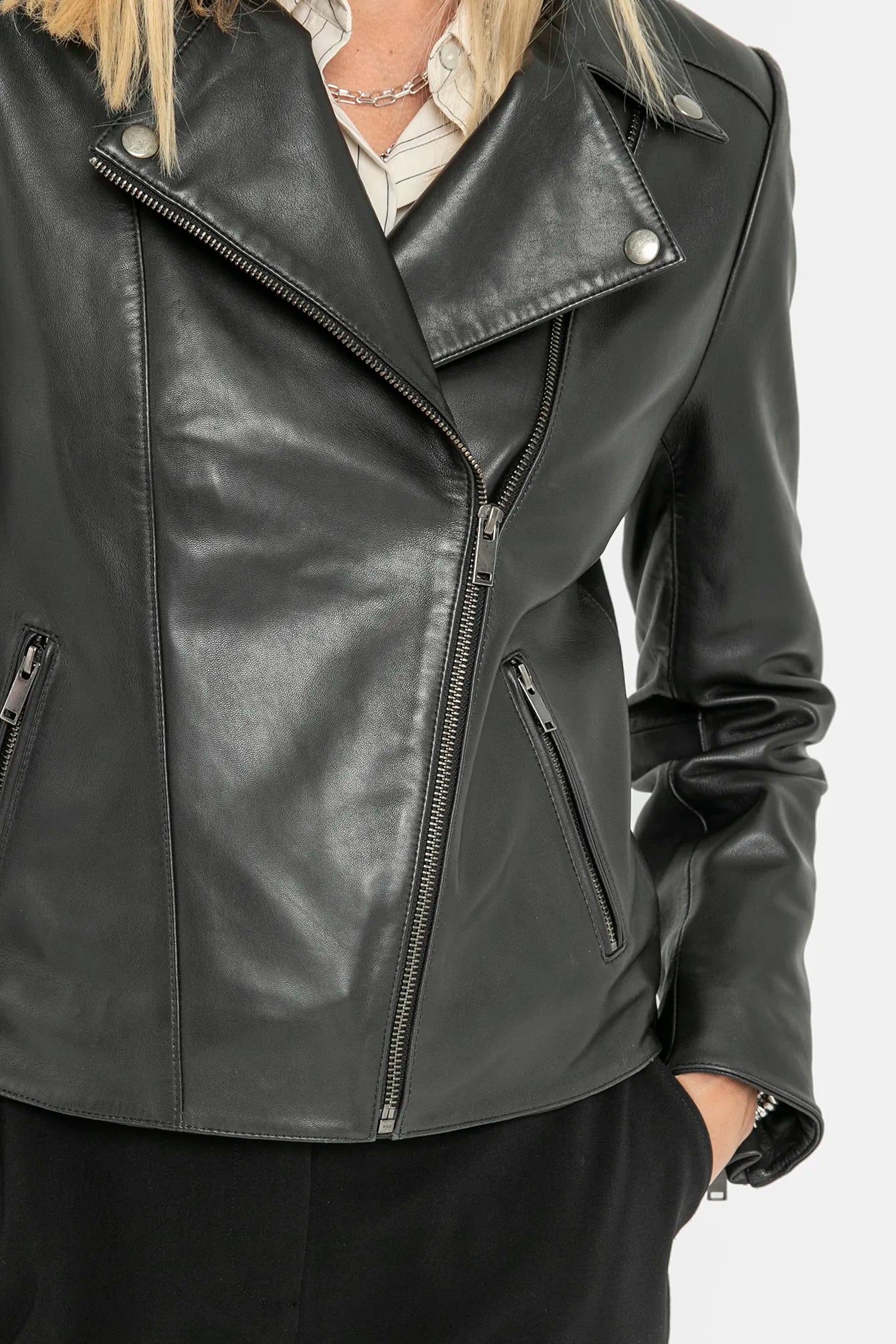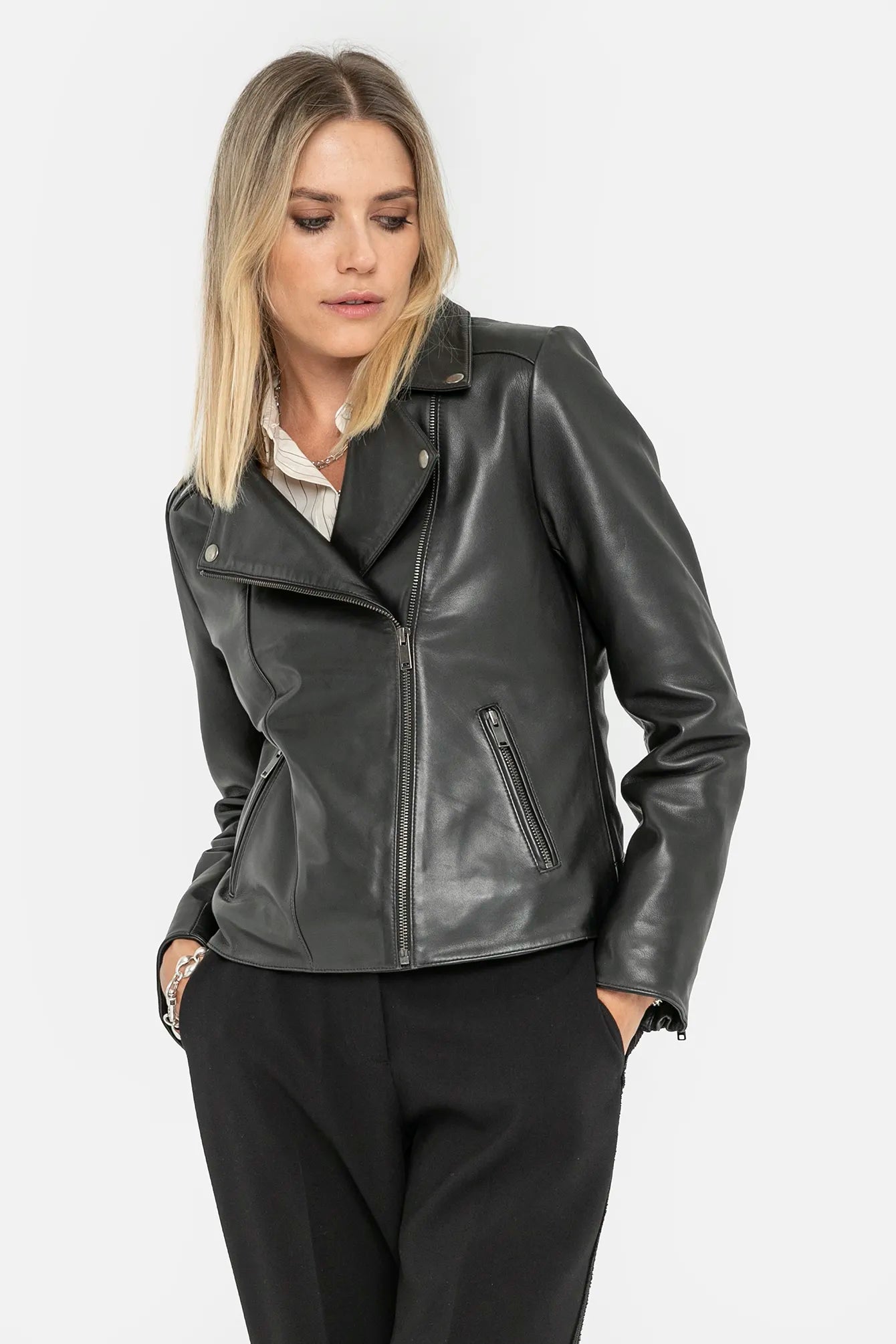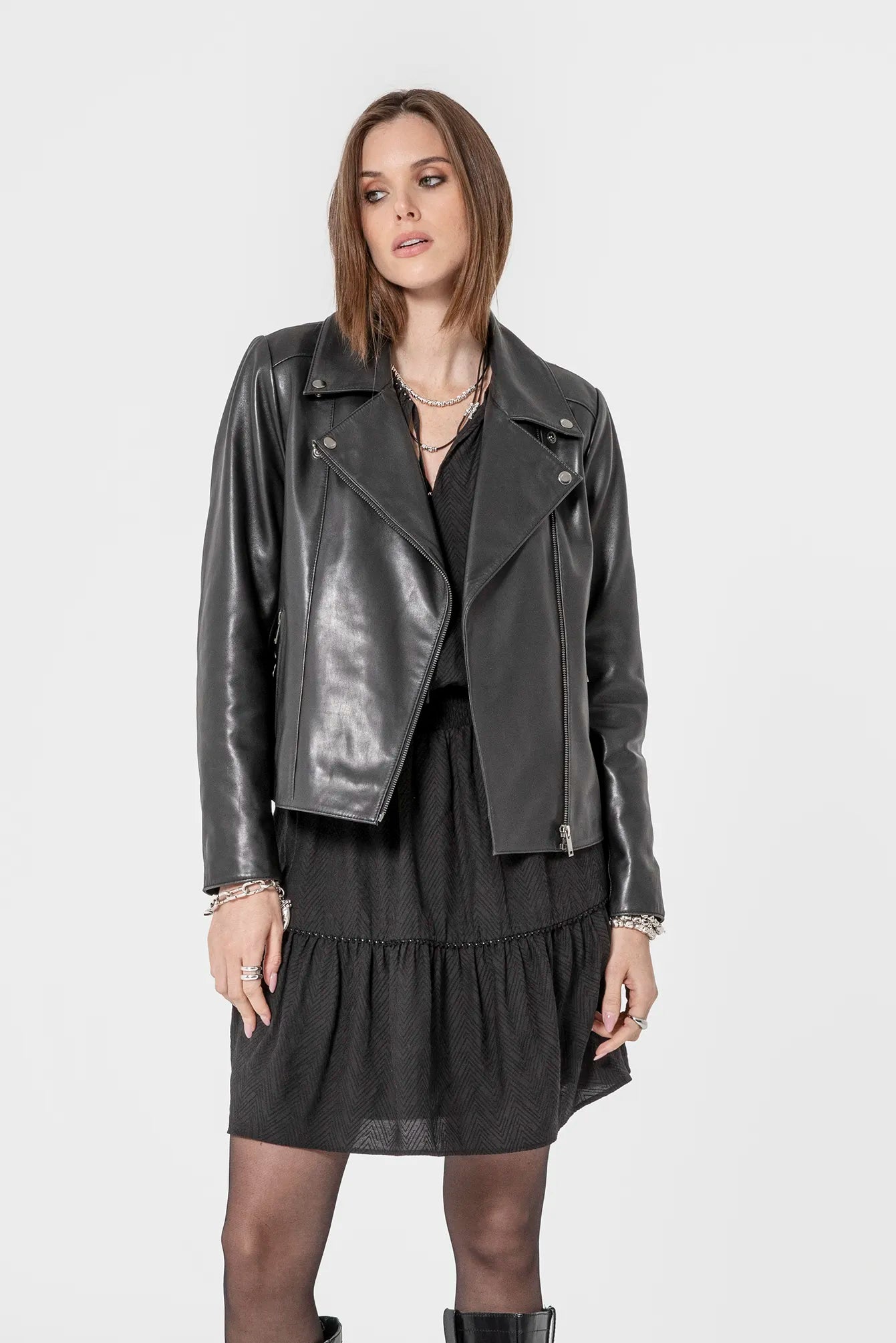 Le perfecto oui, mais en cuir véritable, doux et souple, et avec des détails féminins. On l’adopte à 300% pour la touche rock apportée à nos tenues.