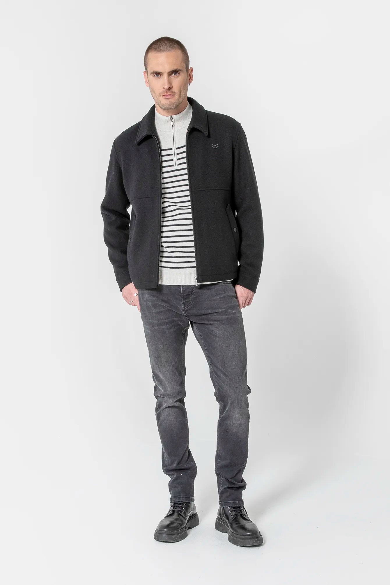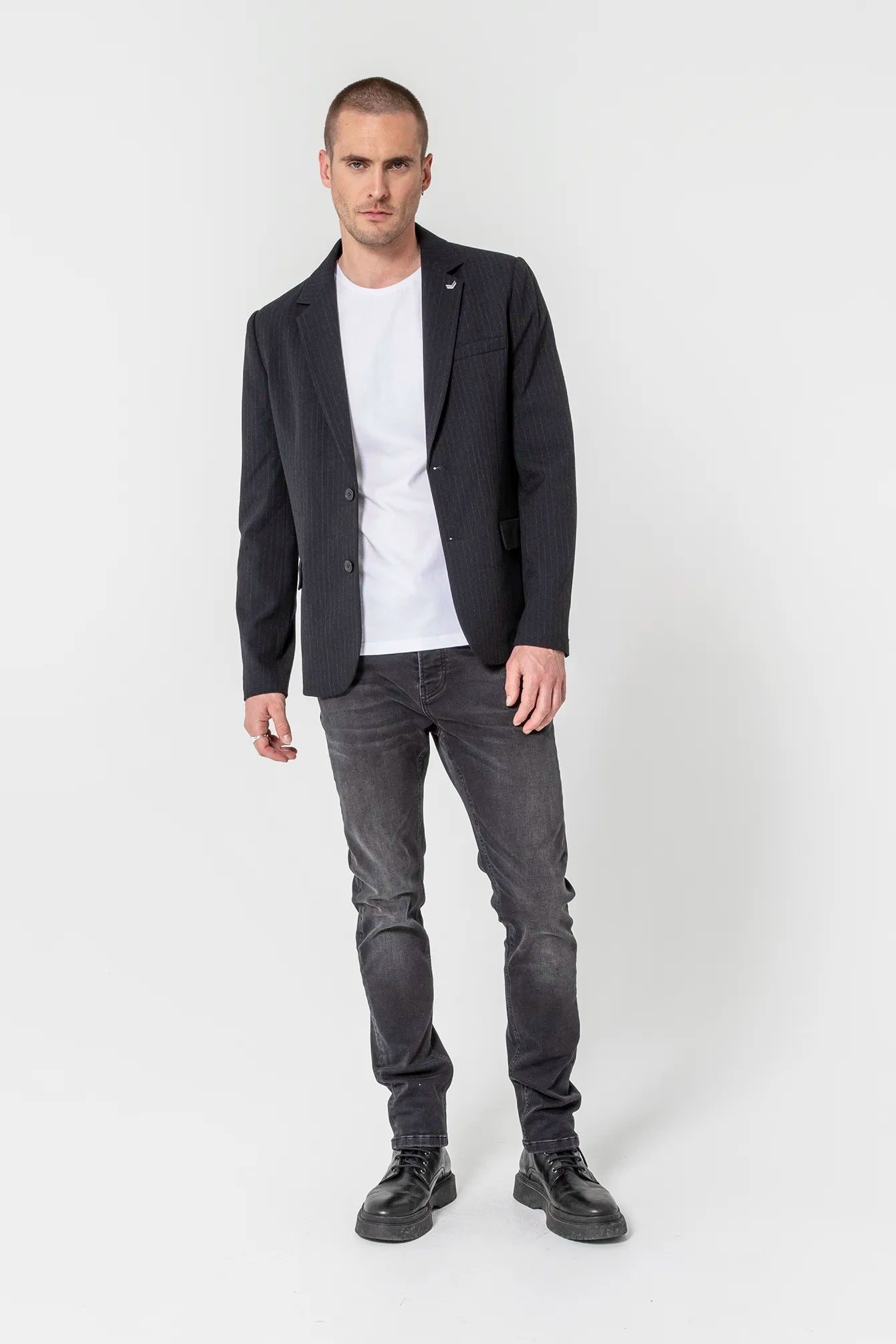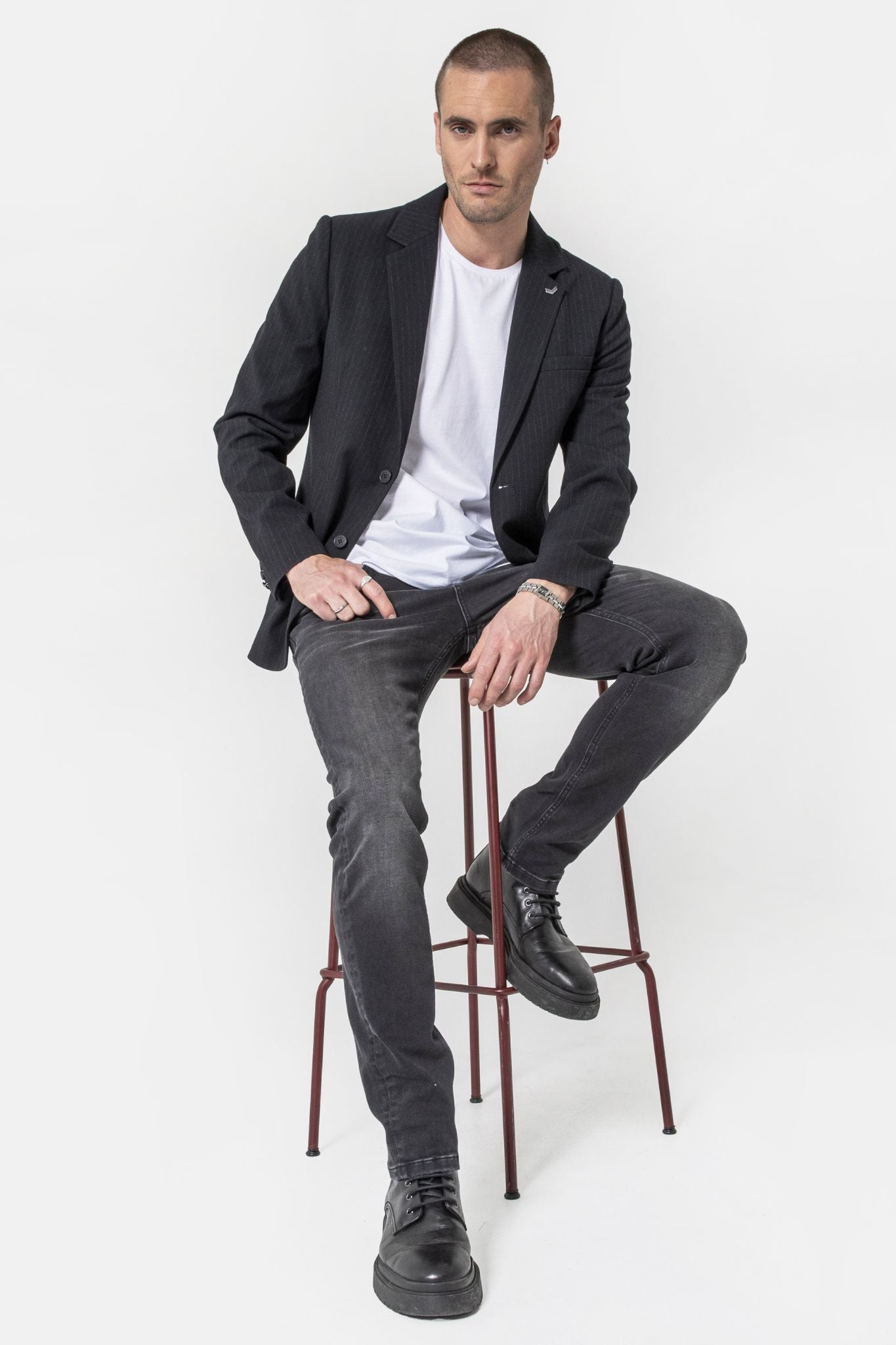 Le denim noir stretch comme une seconde peau ; que ce soit avec le blouson ou avec la veste de costume, il véhicule une élégance brute et affirmée.