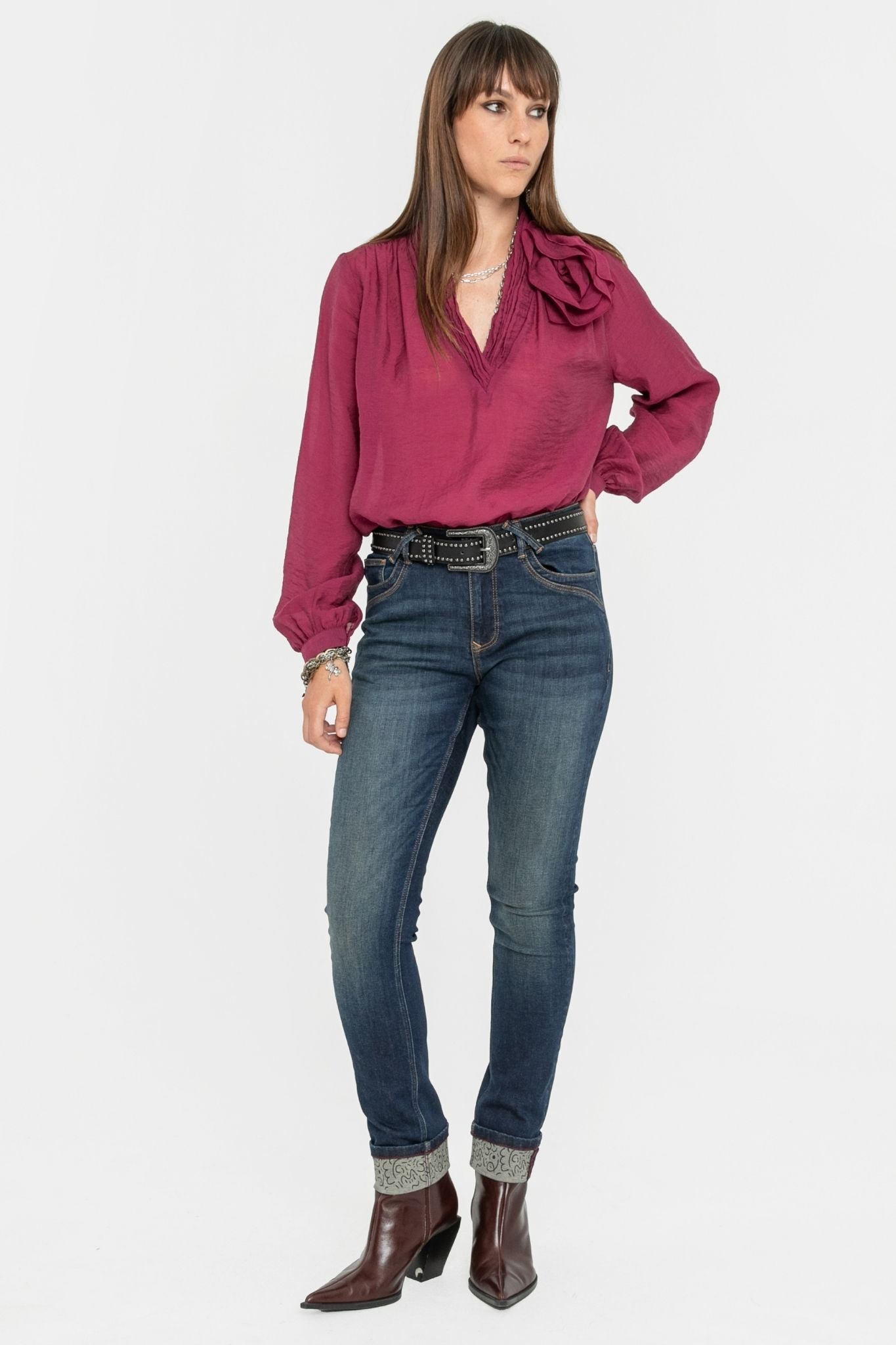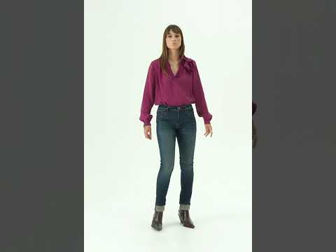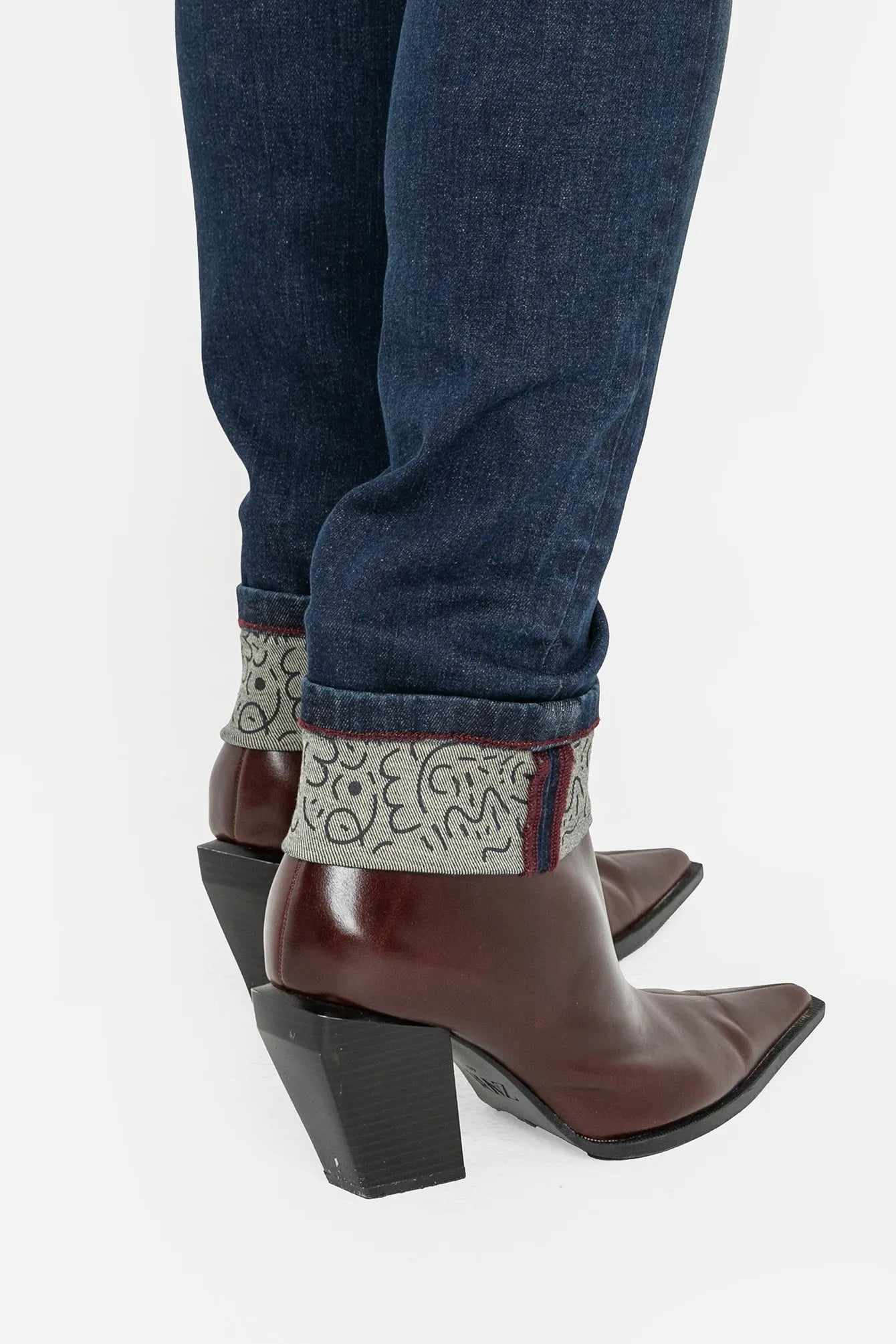 Le denim jauni et le revers en bas de jambe laissant apparaître un print et des coutures bordeaux contrastées, encore un jean qu'il nous faut dans notre dressing !