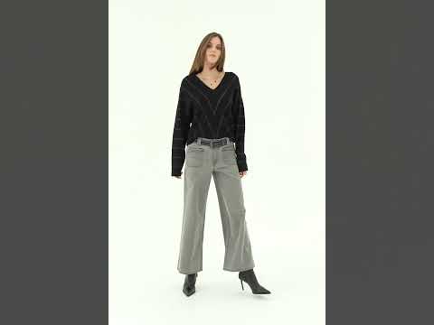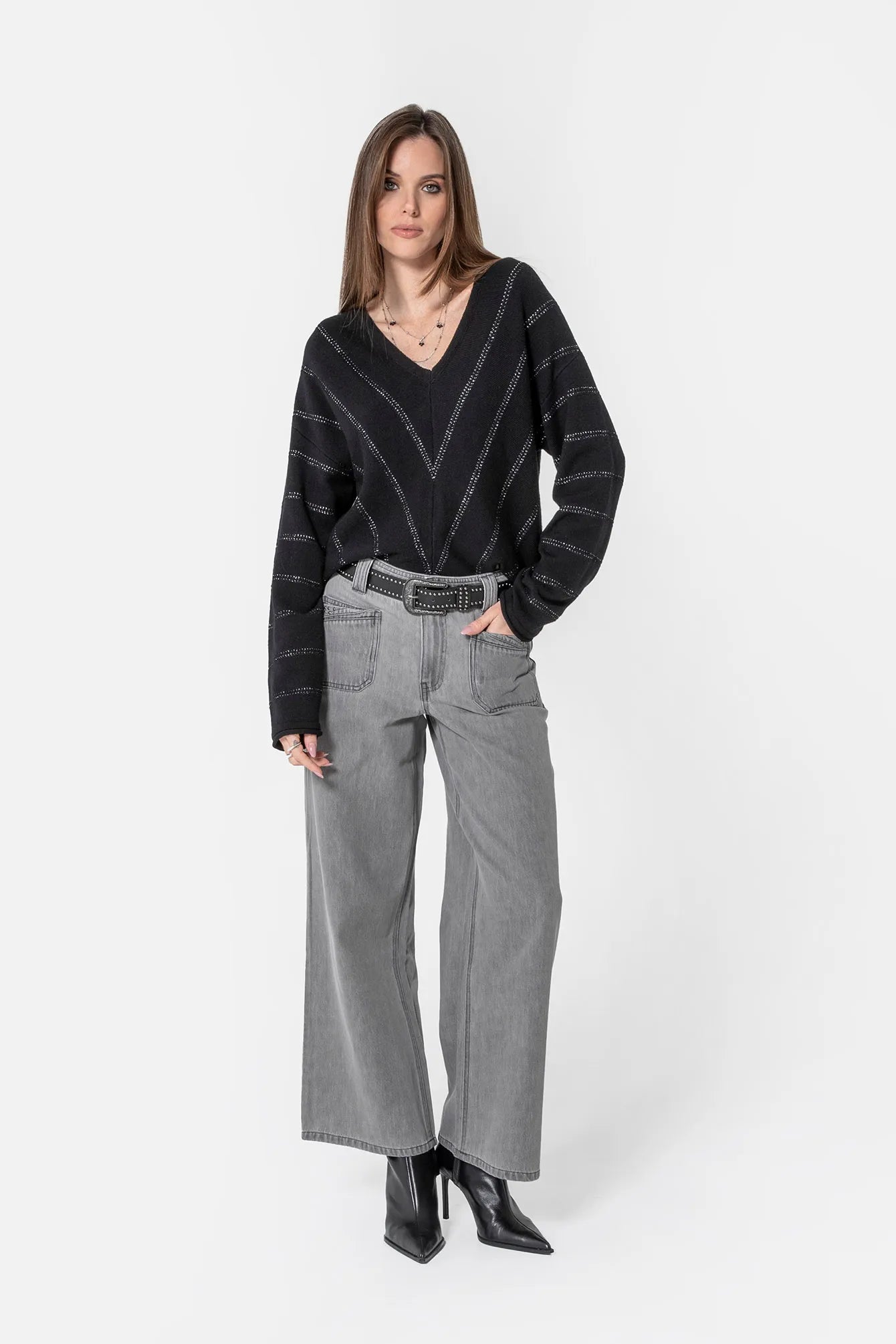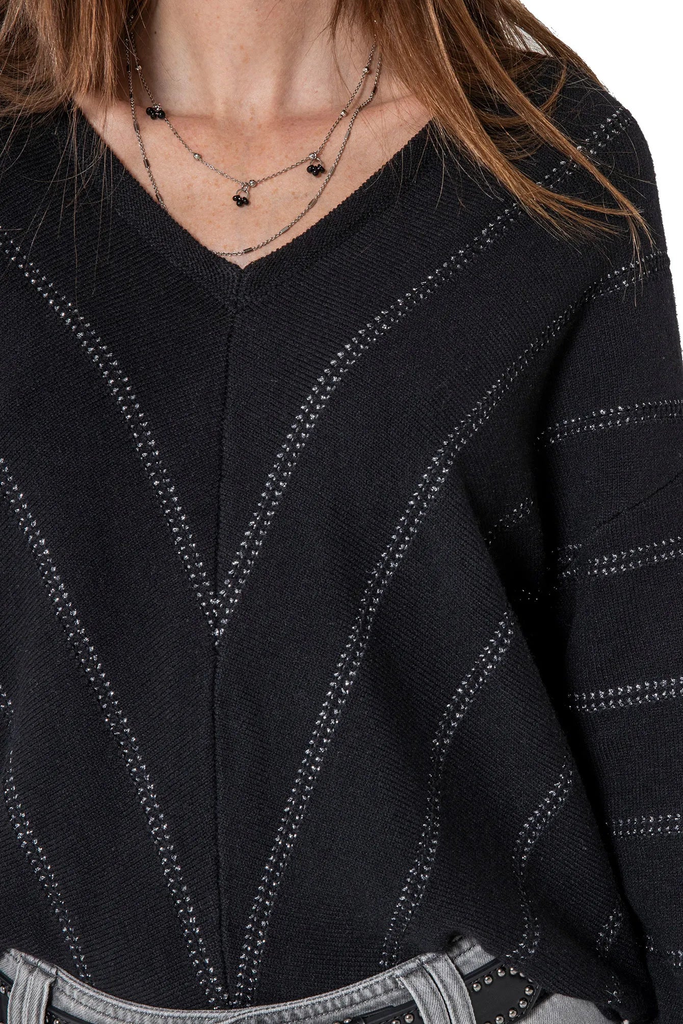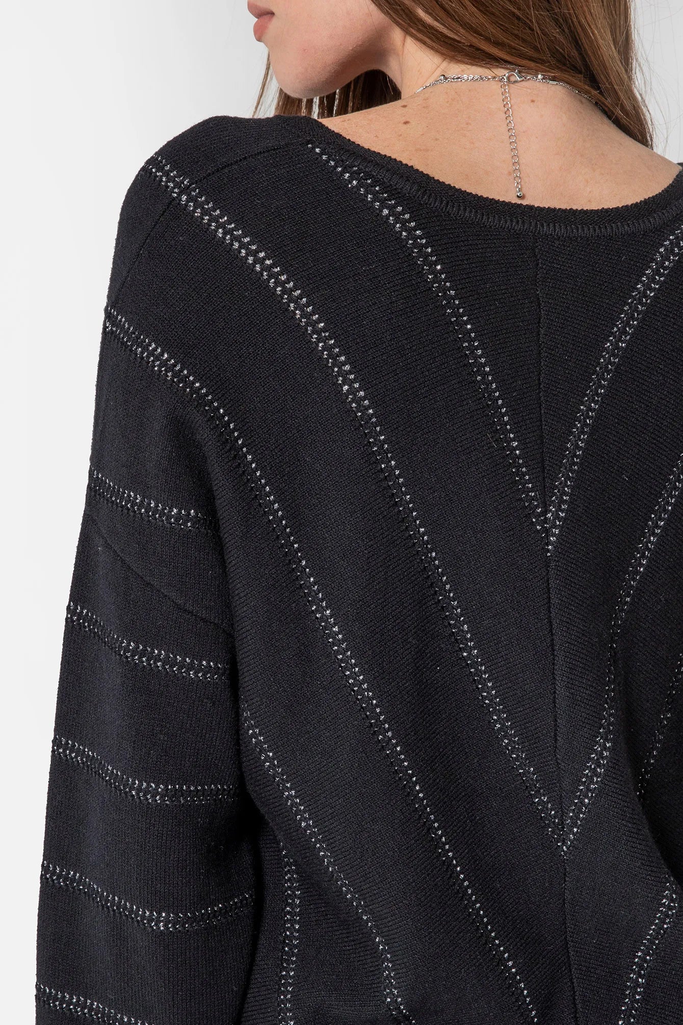 Les grandes rayures ajourées soulignées par un fil lurex et placées en chevron pour allonger la silhouette.