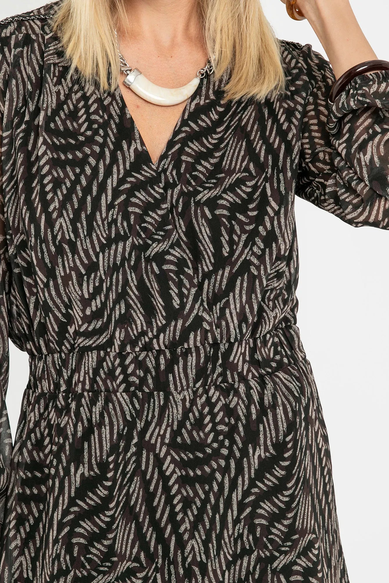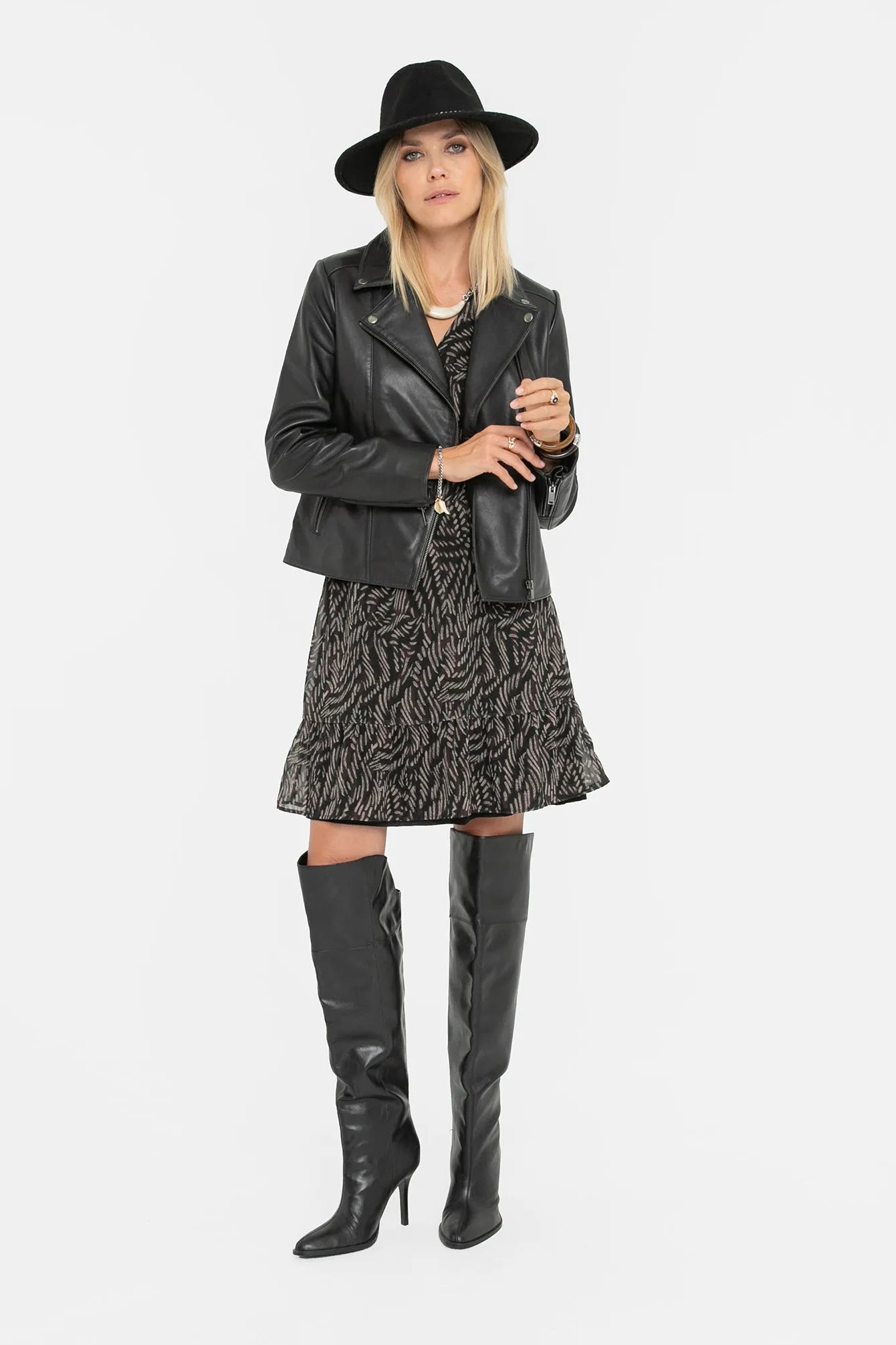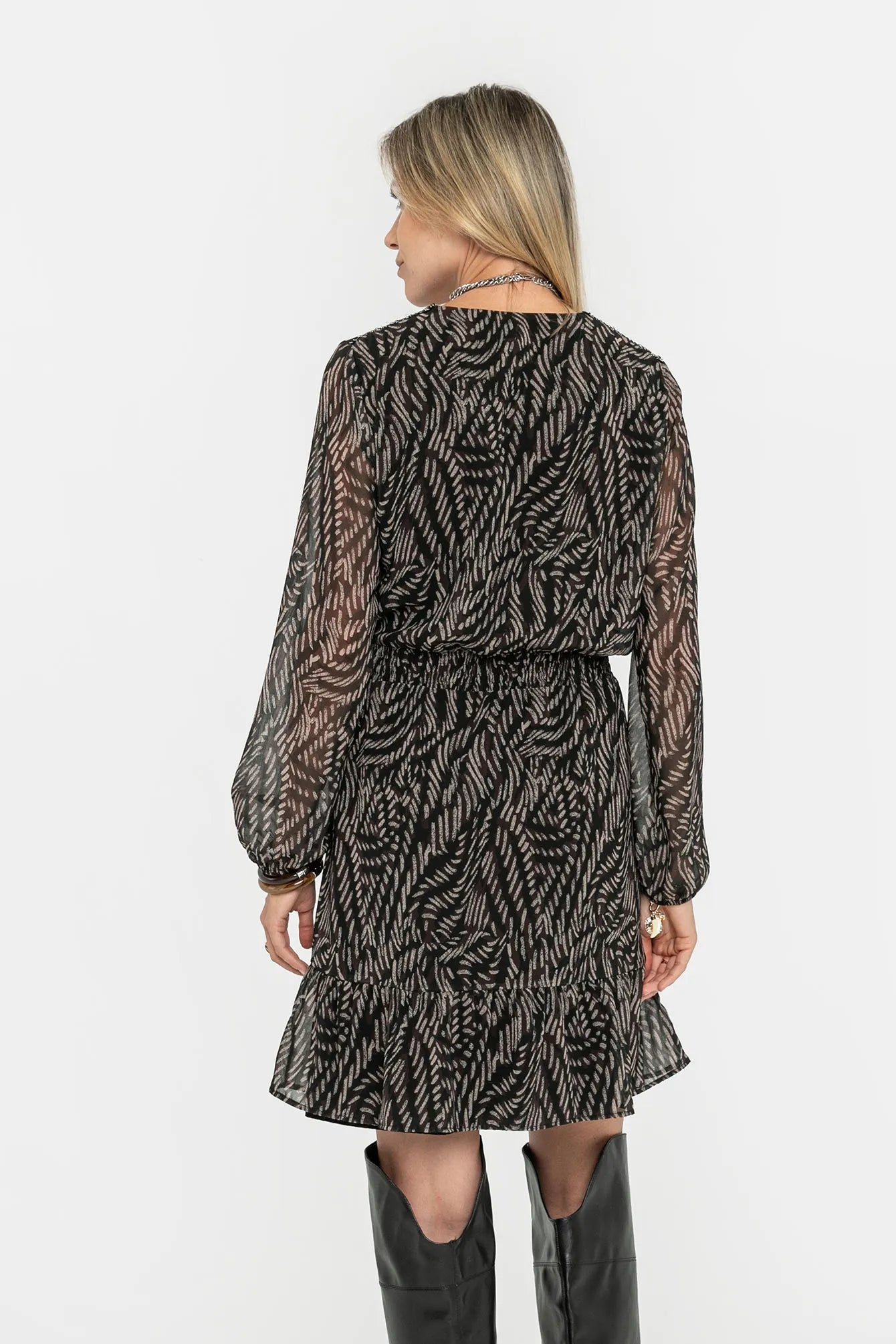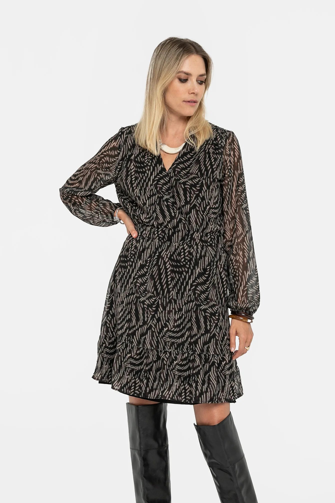 L'imprimé abstrait en choco et noir pour une robe très féminine à porter avec des cuissardes très tendance cet hiver.