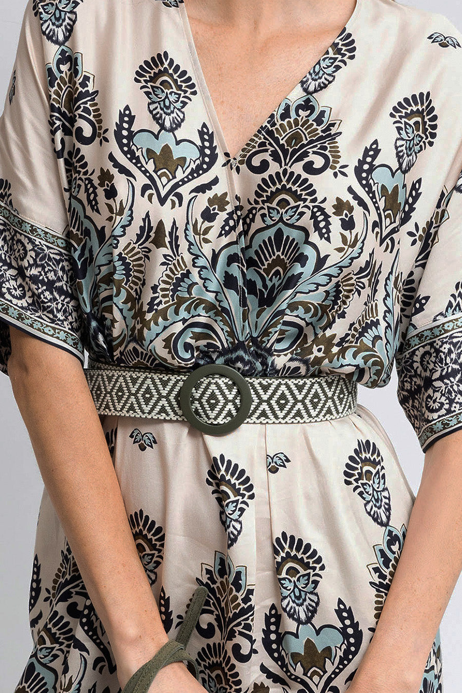 La ceinture en bi-matières au motif ethnique et aux finitions kaki. A porter sur un pantalon ou une robe, elle réhaussera vos tenues avec élégance. Elle s'impose comme un accessoire tendance et sophistiqué.