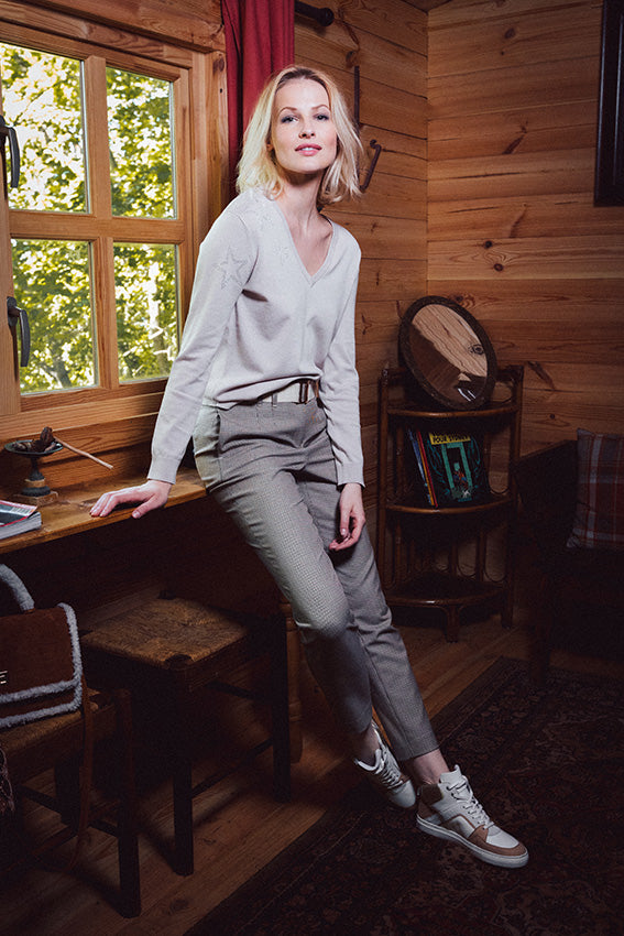 Pull fin col V craie avec étoiles strassées