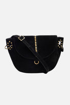 Le look simple et efficace d'une besace en suédine noire ornée de détails fantaisie. Forme besace demi-lune.