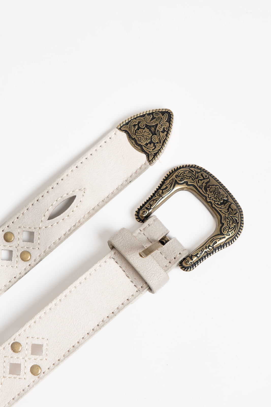 Ceinture en simili cuir suédé avec motifs géométriques perforés et décorée de clous plats. Boucle, ardillon et extrémité gravés antic brass.