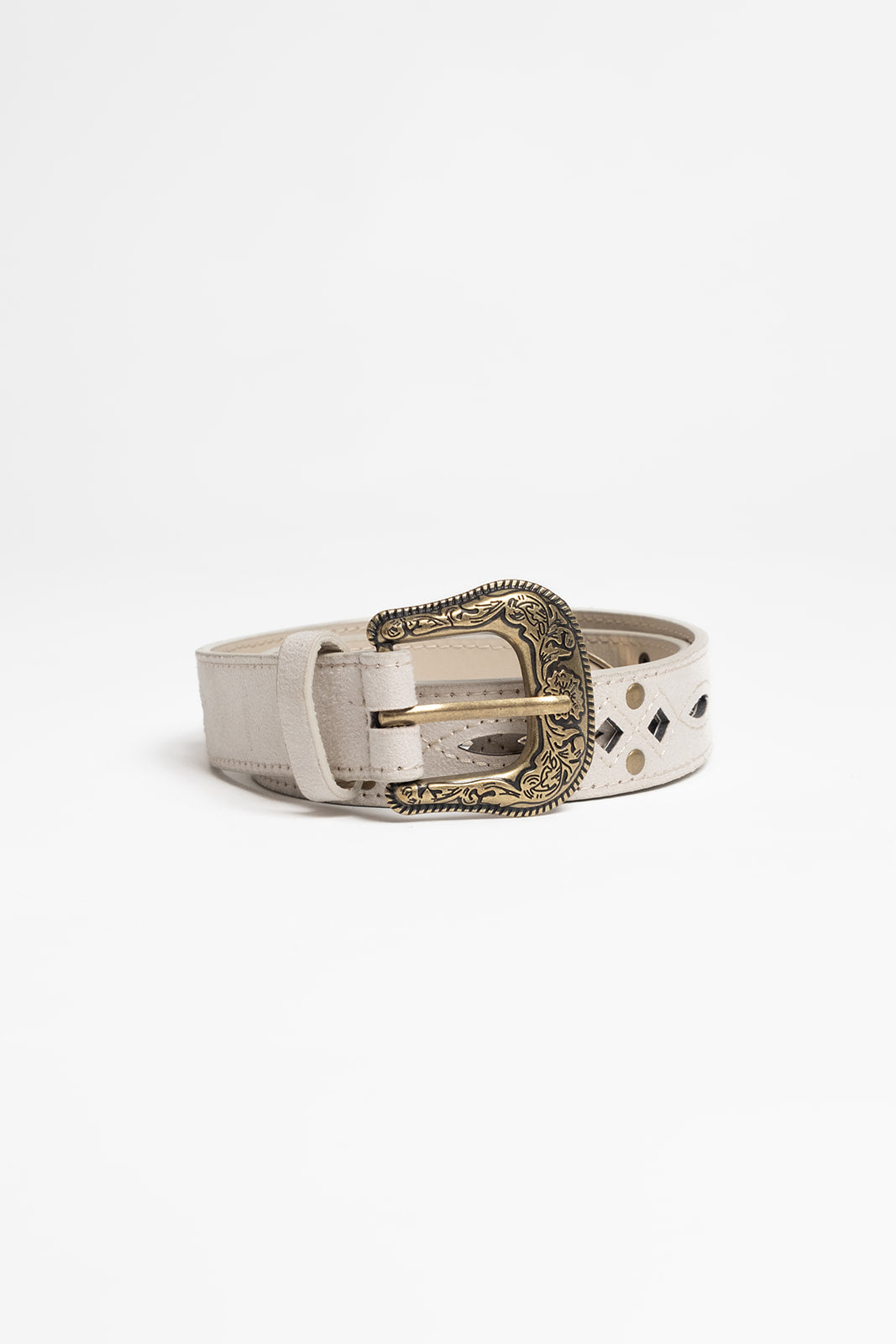 Dieser cremefarbene Gürtel aus Veloursleder verleiht jedem Look eine elegante und grafische Note. Von Elora entworfen, besticht er durch seine ausgestanzten geometrischen Muster und flachen Nieten, die seinen stilvollen Charakter unterstreichen. Schmal und vielseitig kombinierbar, wird er in der Taille getragen und passt perfekt zu Gürtelschlaufen von Hosen oder Röcken. Die gravierte Schnalle und die hochwertigen Details betonen seine gepflegte Ausstrahlung. Ein zeitloses Accessoire – ideal, um ein Outfit dezent zu strukturieren.