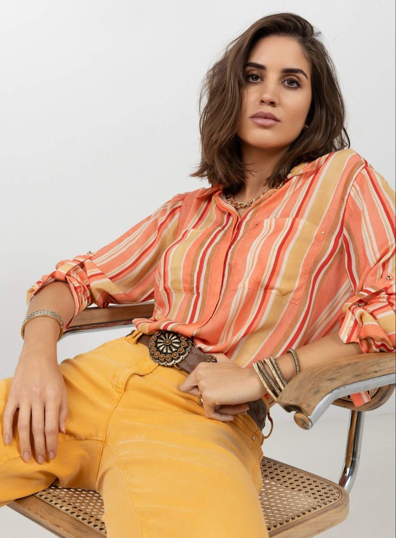Dieses rosagelb gestreifte Hemd verleiht deiner Silhouette einen frischen, eleganten und zugleich entspannten Look – von Elora entworfen, um Farbe in deinen Alltag zu bringen. Der gerade, weite Schnitt mit abgerundetem Saum sorgt für einen modernen, fließenden Fall. Die verdeckte Knopfleiste und die Brusttaschen mit Nieten setzen zeitgemäße Akzente. Hochkrempelbare Ärmel machen das Hemd besonders vielseitig. Ein strahlendes, ausdrucksstarkes Lieblingsstück – perfekt für mutige, feminine Looks.