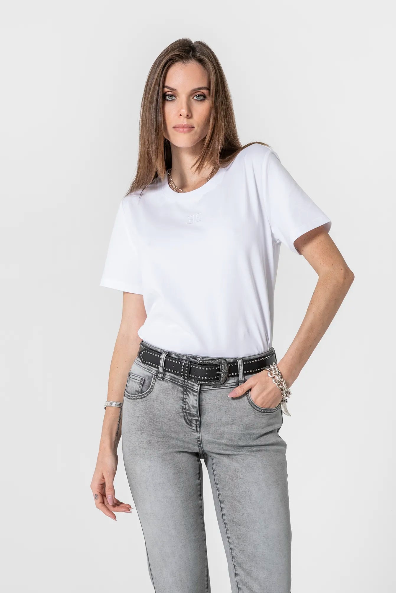 Jersey aus Bio-Baumwolle mit Elasthan. Rundhalsausschnitt aus Ripp. Kurze Ärmel. Ton-in-Ton Doppel-E-Stickerei mittig vorne.