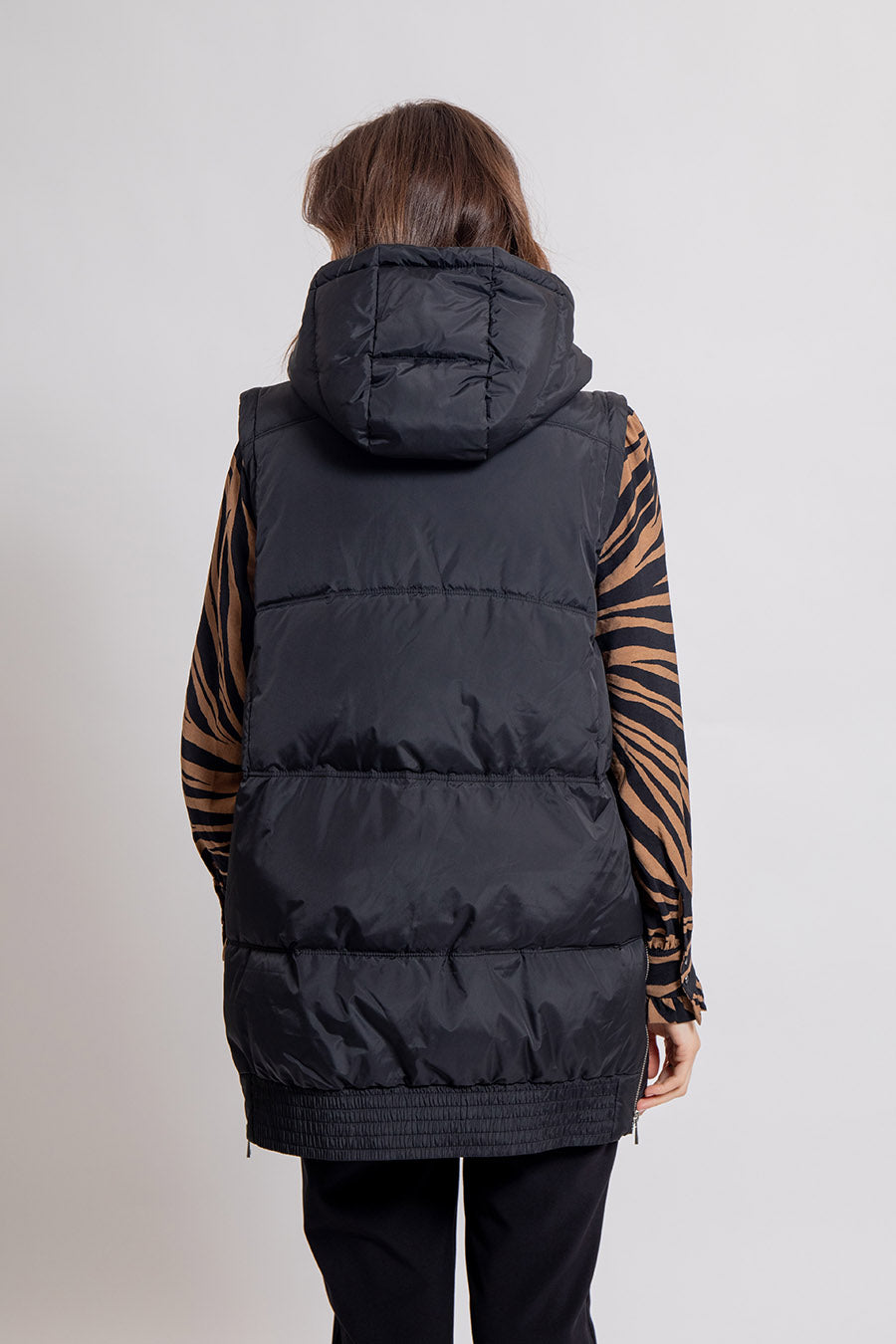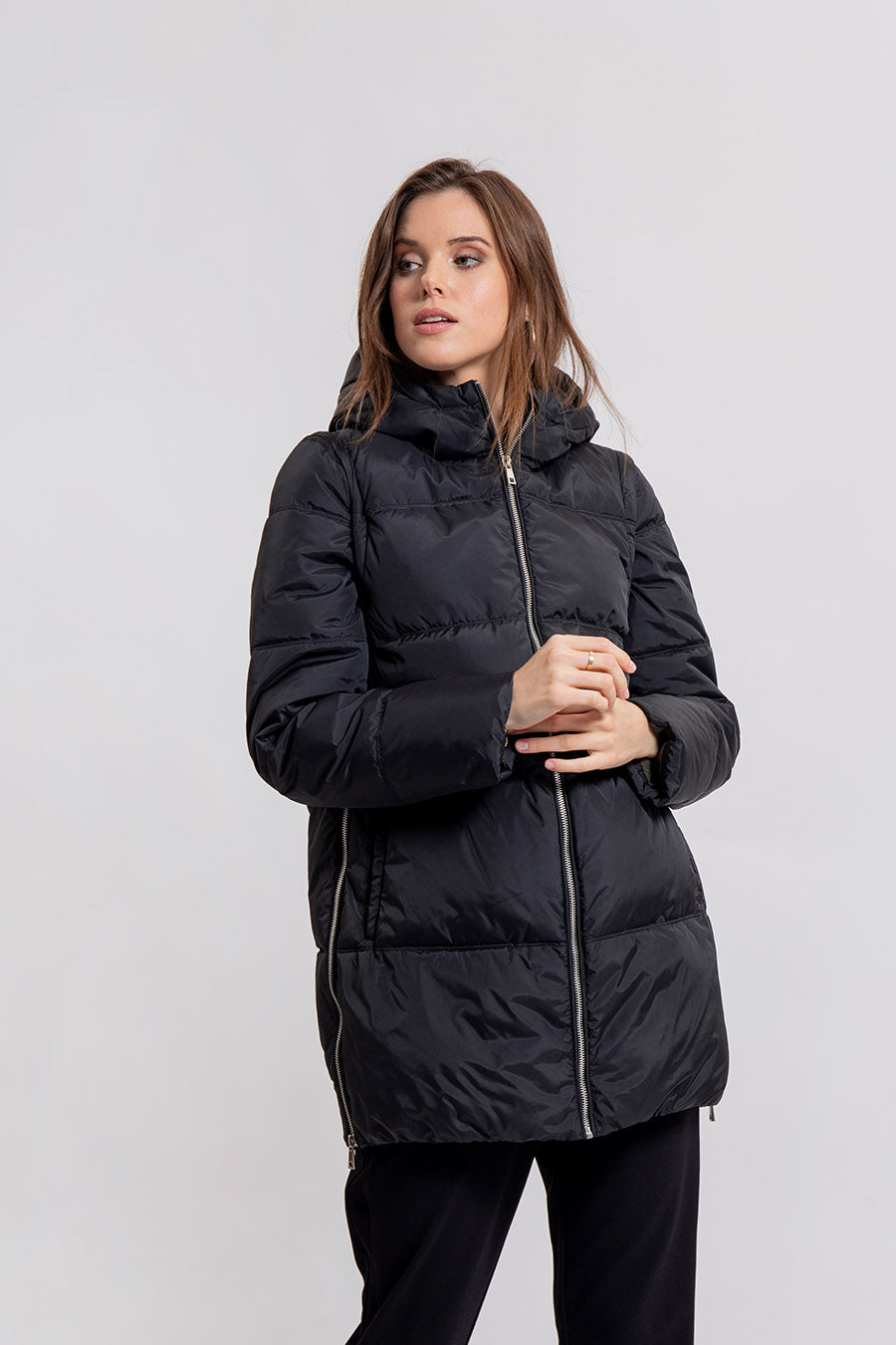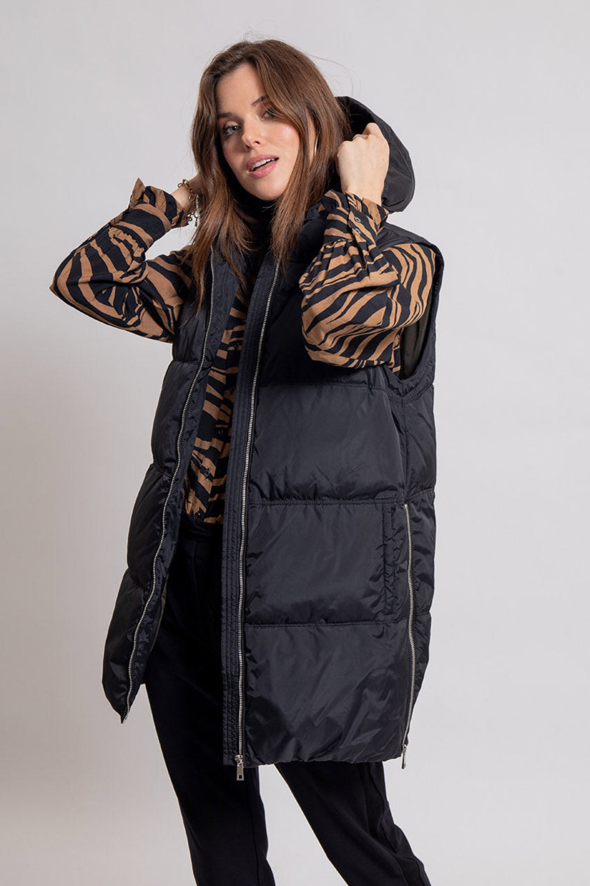 Schwarze, mittellange Steppjacke mit abnehmbaren Ärmeln