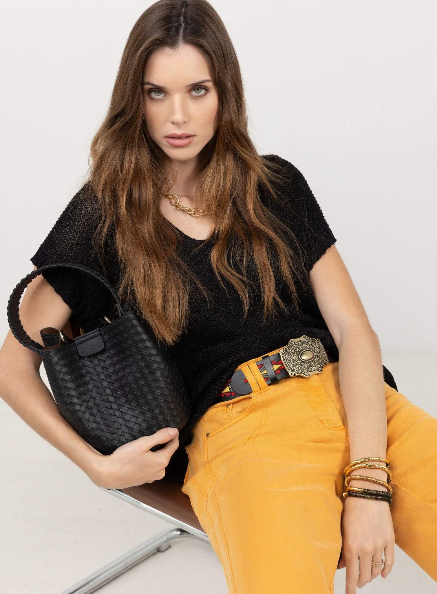 Bei Elora sind wir überzeugt: Eleganz und Verantwortung gehören zusammen. Saison für Saison setzen wir mehr nachhaltige Materialien ein – Bio-Baumwolle, recyceltes Polyester und Polyamid, Leinen, Lyocell ... Wir setzen auch auf innovative Verfahren wie das Trockenwaschen von Jeans.