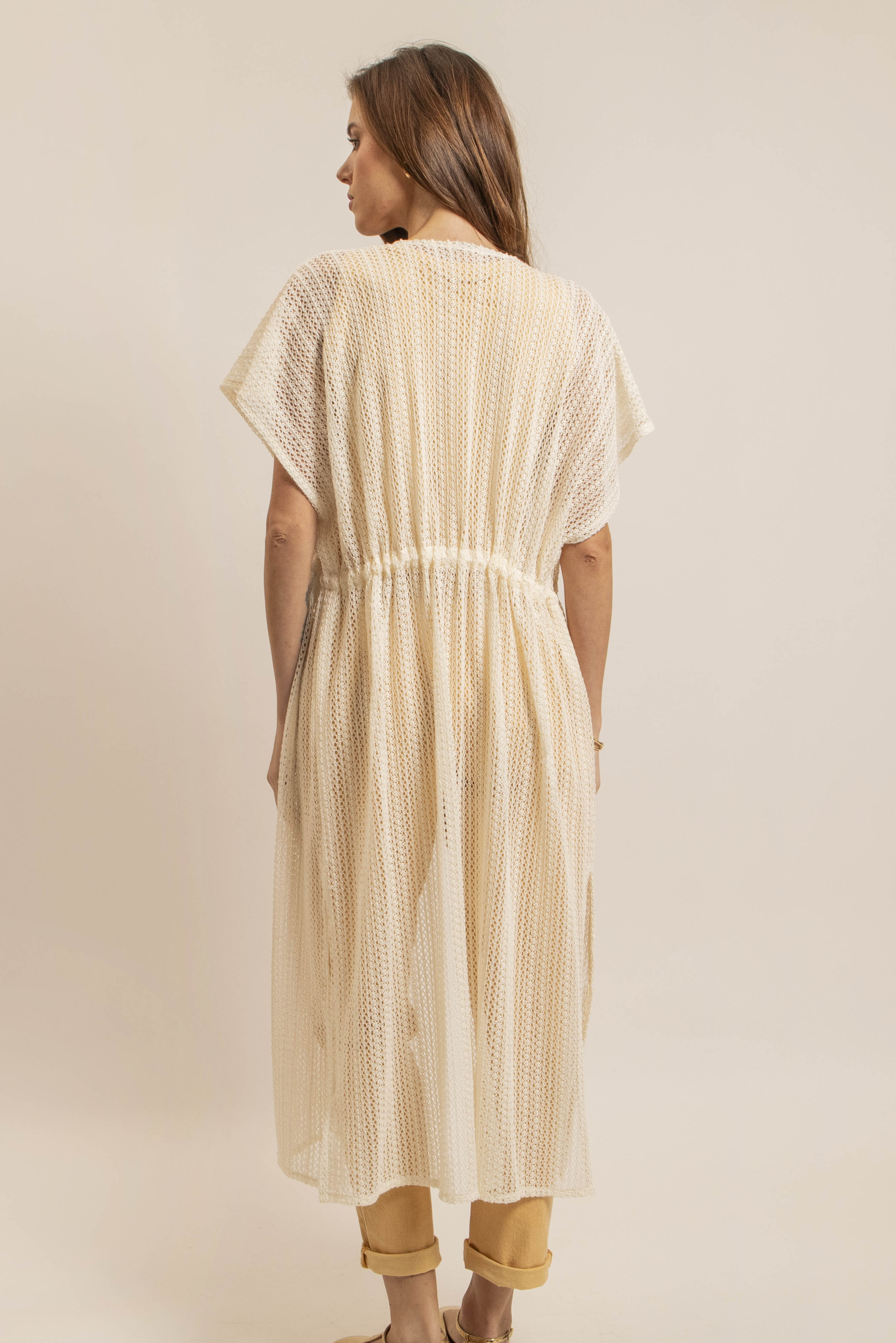 Feines Strickmuster in Ecru mit Makramee-Effekt. Bindegürtel in der Taille. Seitliche Schlitze.