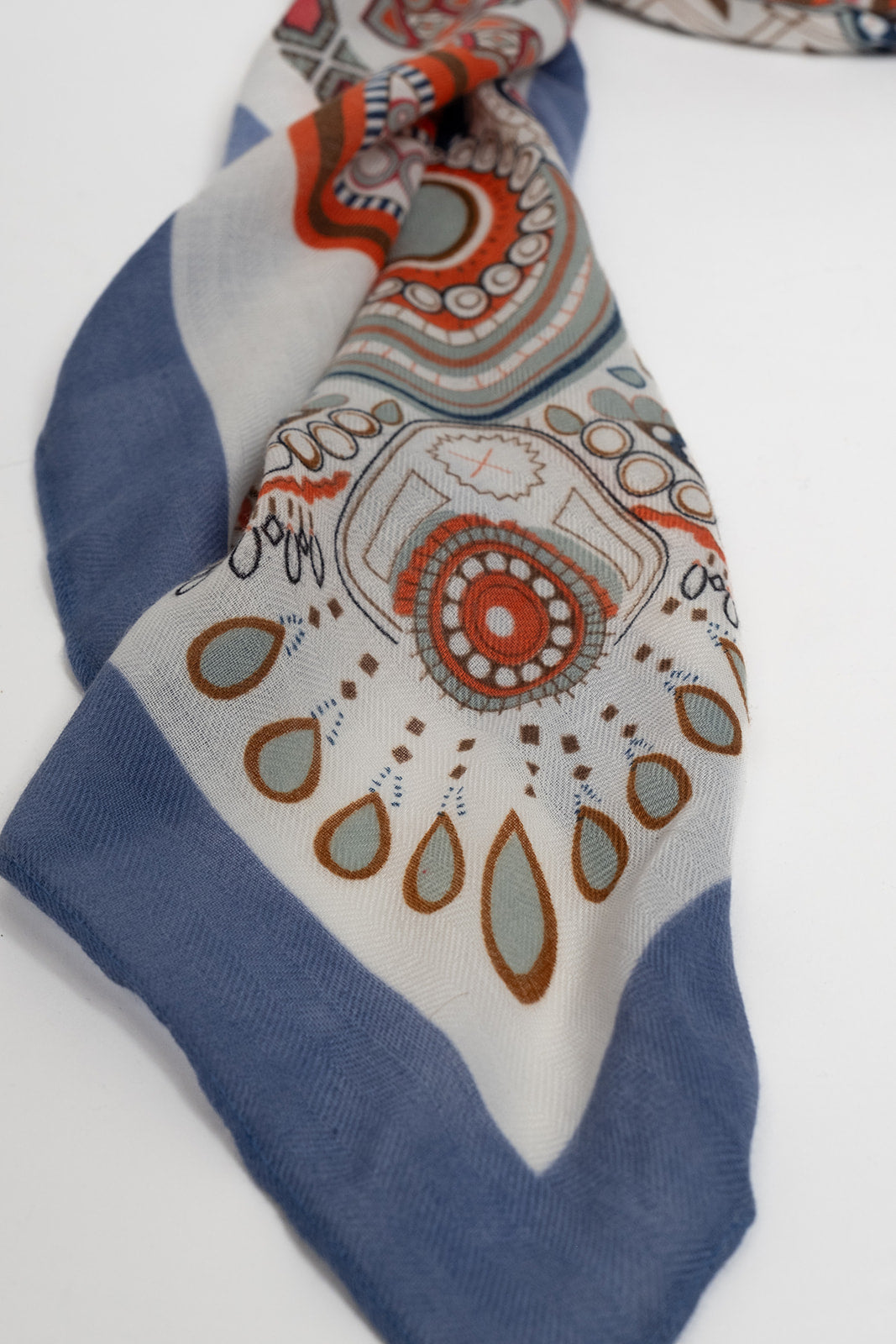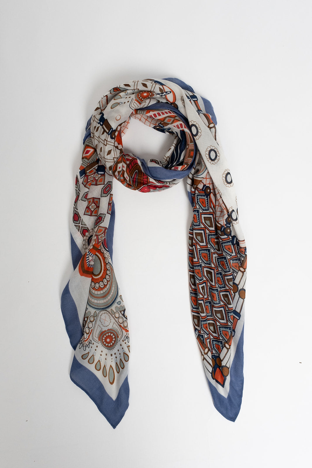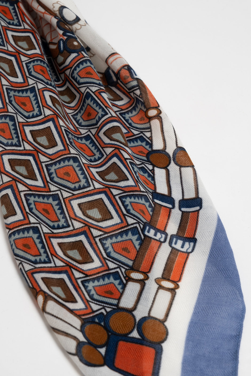 This multicolored square scarf captivates with its animal print scarf design, created by Elora to bring character with a touch of lightness. Its XXL size offers endless styling possibilities—wear it around your neck, draped over your shoulders, or as a chic bag accessory. The soft, fluid fabric moves gracefully, while the off-white background framed in blue gives structure to the pattern. Finished with a hem on all four sides, this piece is a must-have to personalize your looks with style and boldness.