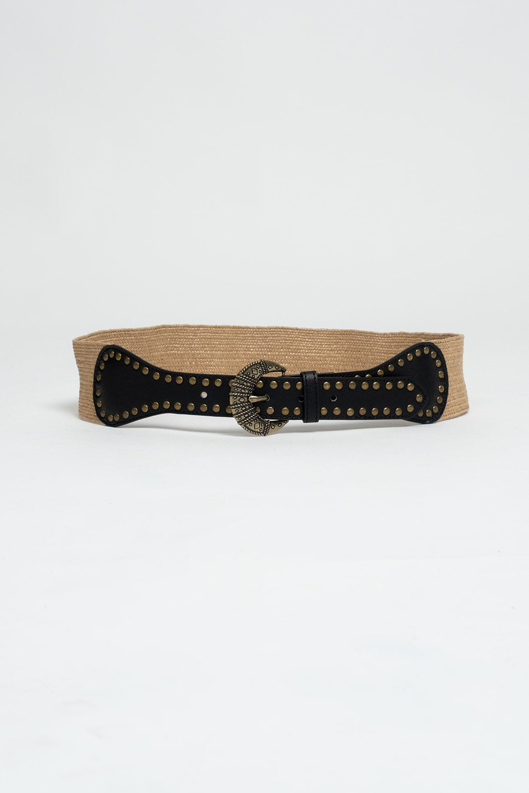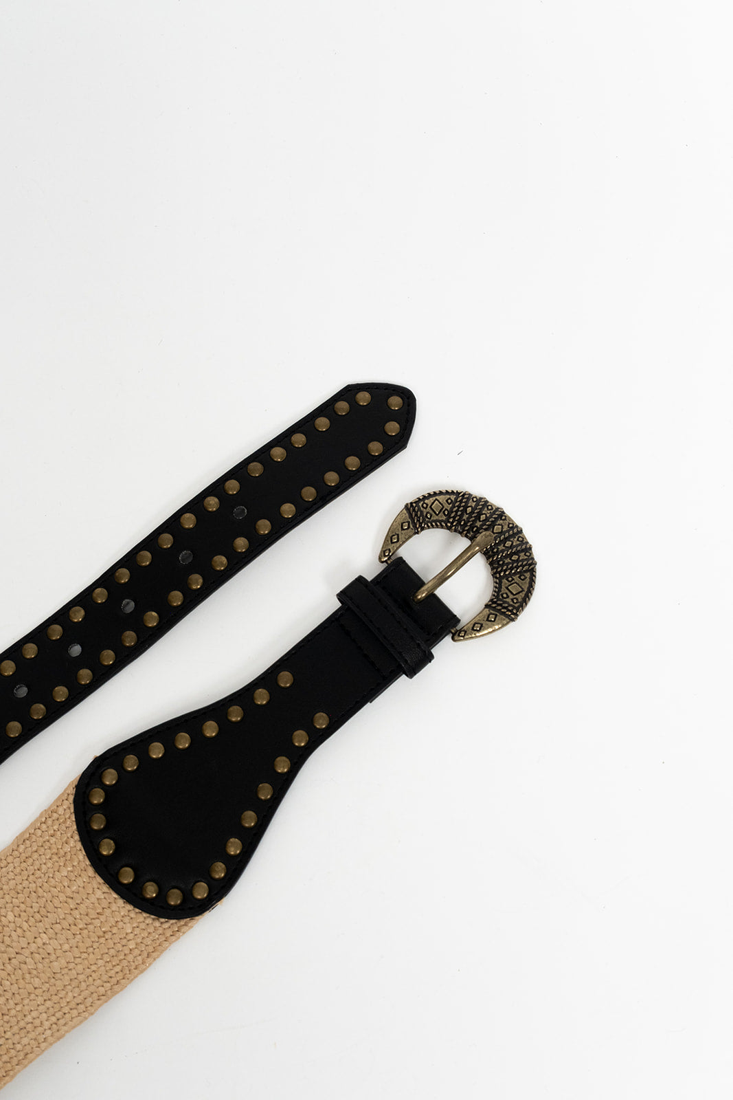 This natural and black belt defines the waist with a bold, rock-inspired look. Designed by Elora, it combines a wide straw-effect elastic band with an engraved metal buckle to shape your silhouette with character. Worn at the waist, its corset-style design highlights your curves while remaining comfortable. The faux leather finishes and aged metal details add an authentic touch. A statement accessory, perfect for transforming an outfit and expressing a daring sense of style.