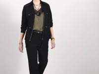 This black jacket reimagines the safari style with contemporary elegance, designed by Elora to beautifully structure your silhouette. Its straight cut with a slightly rounded hem features a deep neckline and a tie belt that subtly highlights the waist. Golden piping and metallic eyelets add a touch of radiance, while the flap pockets enhance its chic spirit. Available in two colors, it’s a standout piece—perfect for a confident, feminine look.