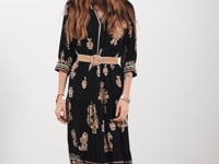 This long black and beige printed dress embodies a confident gypset bohemian style, designed by Elora. Its lightweight viscose voile moves gracefully with you, while the slightly flared straight cut elongates the silhouette down to the ankle. The exclusive baroque print, generous ruffles, and puffed sleeves add character. The metallic buckle belt, with western-inspired accents, brings structure to the look. A statement piece, perfect for expressing a free-spirited and radiant femininity.
