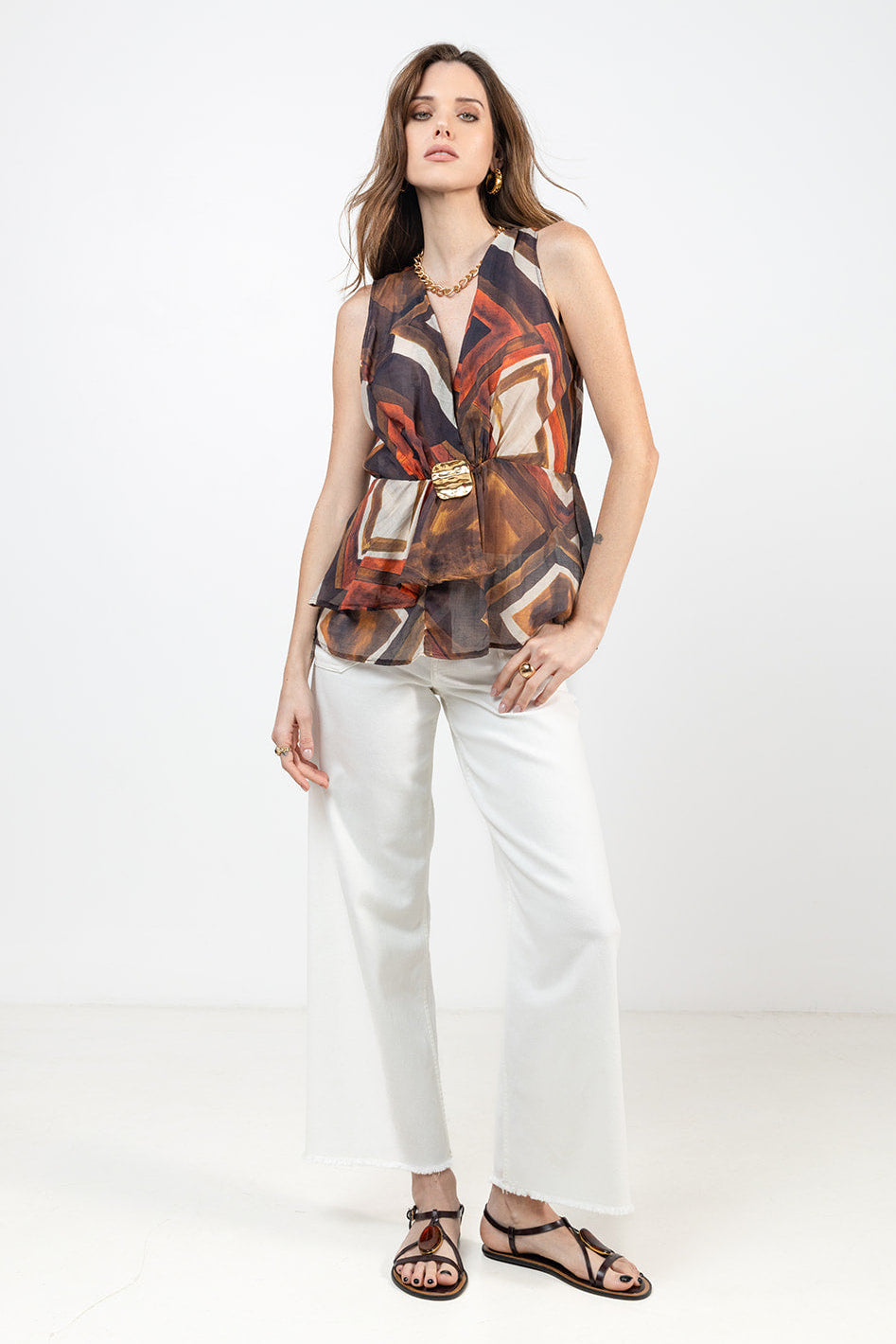 This printed top in shades of ecru, chili, and chocolate brings a warm, graphic style, perfectly in tune with the Elora spirit. Its fitted, elasticated cut shapes the figure with elegance, while the wrap-over neckline beautifully highlights the neck. The decorative buckle adds a precious touch, enhanced by the play of asymmetric ruffles that bring movement to the piece. Easy to wear both every day and for evenings out, it becomes a standout item for creating feminine, modern, and confident looks.