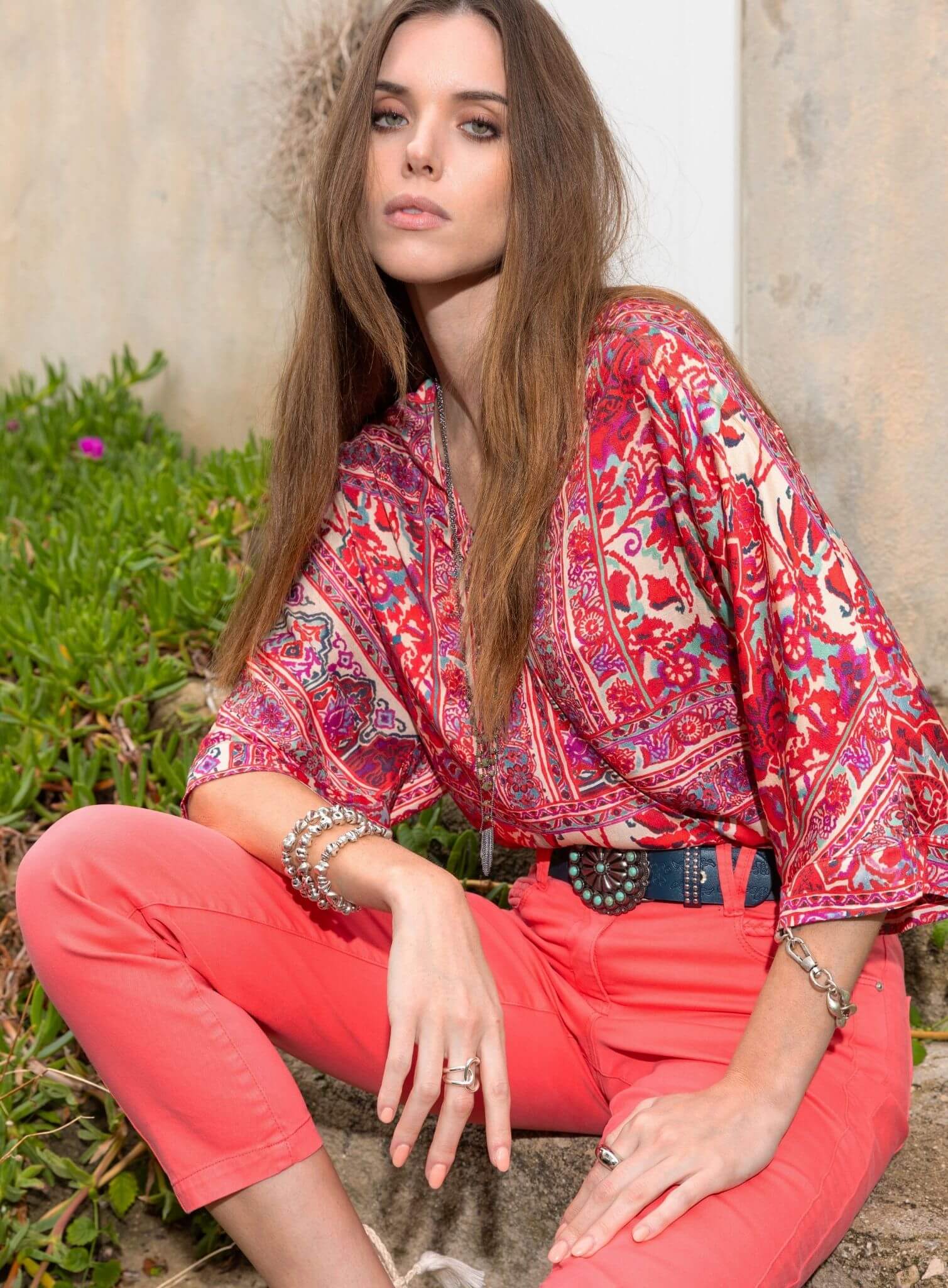 This red and pink blouse makes a bold statement with its vibrant oriental print, designed by Elora to instantly brighten your silhouette. Its blouson cut offers a fluid, flattering drape, while the V-neckline created by overlapping panels adds a touch of refined femininity. The 3/4 sleeves with turned-up cuffs and the smocked hem give the piece a modern structure. Crafted from exclusive Italian fabric, it becomes a standout piece—perfect for energizing your everyday wardrobe.