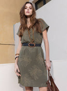 This khaki dress stands out with its perfect drape and raised feather print, designed by Elora to bring a touch of confident bohemian elegance. Its straight cut and above-the-knee length create a fluid silhouette, which you can wear belted to highlight your waist or loose for a more relaxed look. The V-neckline and dropped armholes add a sense of lightness, while the back slit enhances comfort. Made in France, it’s a feminine, modern piece that’s easy to wear every day.