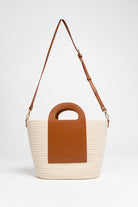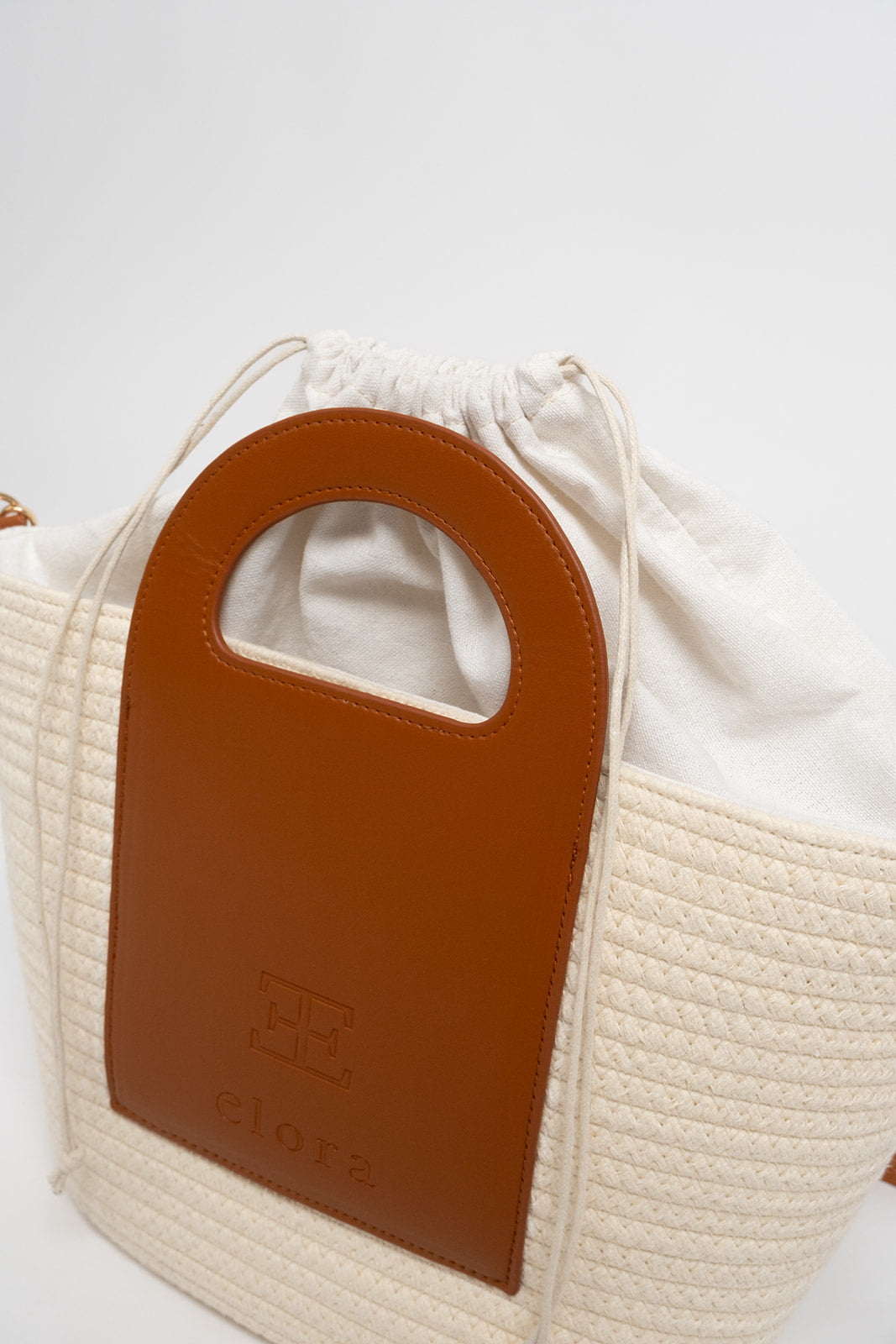 This ecru and camel basket bag charms with its blend of natural materials, designed by Elora to stylishly complement spring looks. Its bucket shape and cotton rope weaving give it a modern bohemian flair, while the embossed faux leather pockets structure the design and serve as handles for an elegant hand-carry. Practical for everyday use, it is lined and features interior compartments. A versatile accessory, as chic as it is functional.