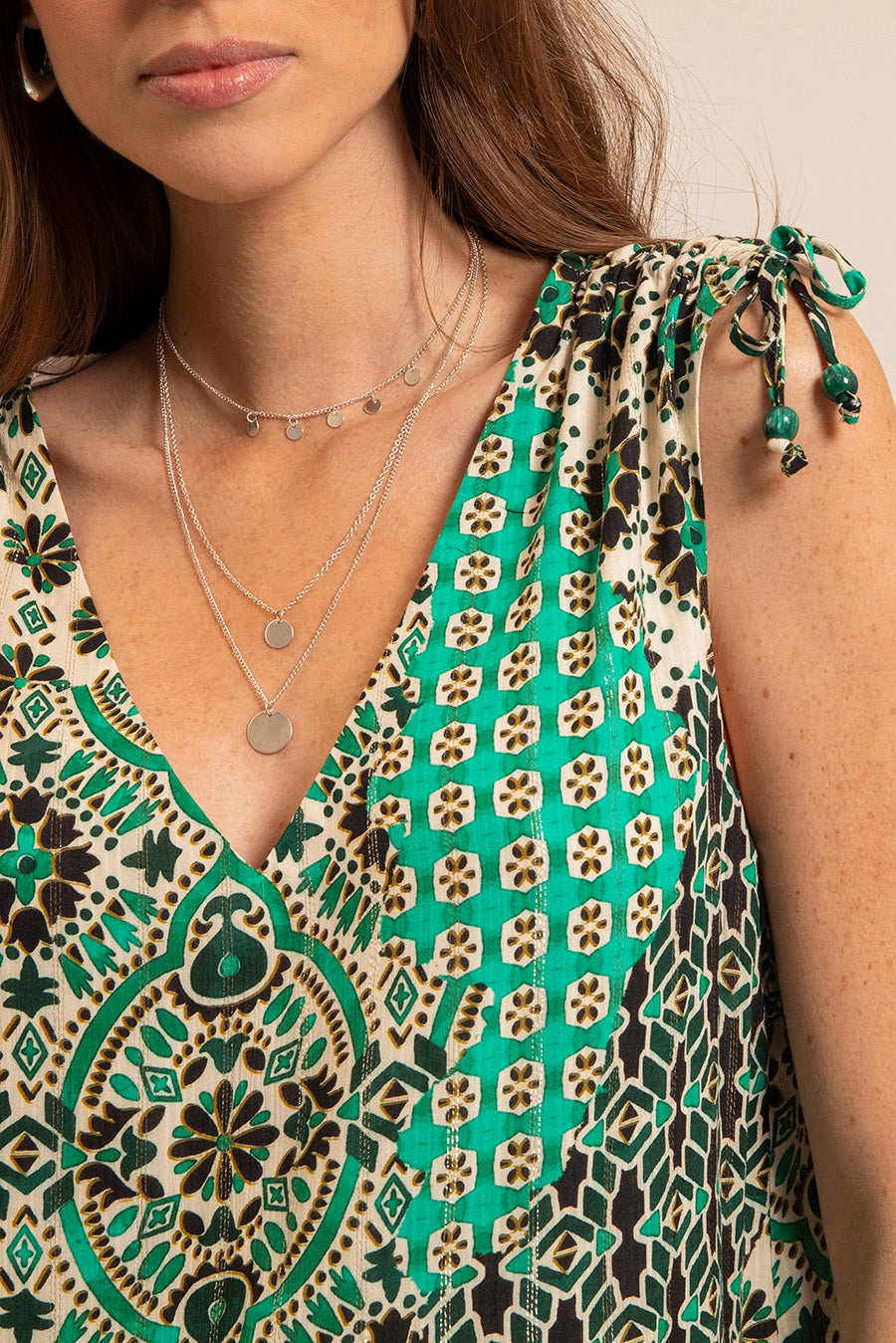 The top with a bohemian patchwork print, enhanced by its fine ruched and tied straps that add a delicate, feminine touch. Its flattering V-neckline and fluid fabric make it the perfect piece for a summer look.