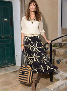 This long black and ecru printed skirt embodies a chic bohemian style full of character, designed by Elora to bring lightness to every silhouette. Its graphic tie-dye print adds a modern touch, while the straight cut, slightly flared at the hem, creates beautiful movement. The drawstring waist ensures optimal comfort, and the removable belt lets you adjust the fit as you wish. Flowing and feminine, it becomes a statement piece for creating radiant and elegant looks.