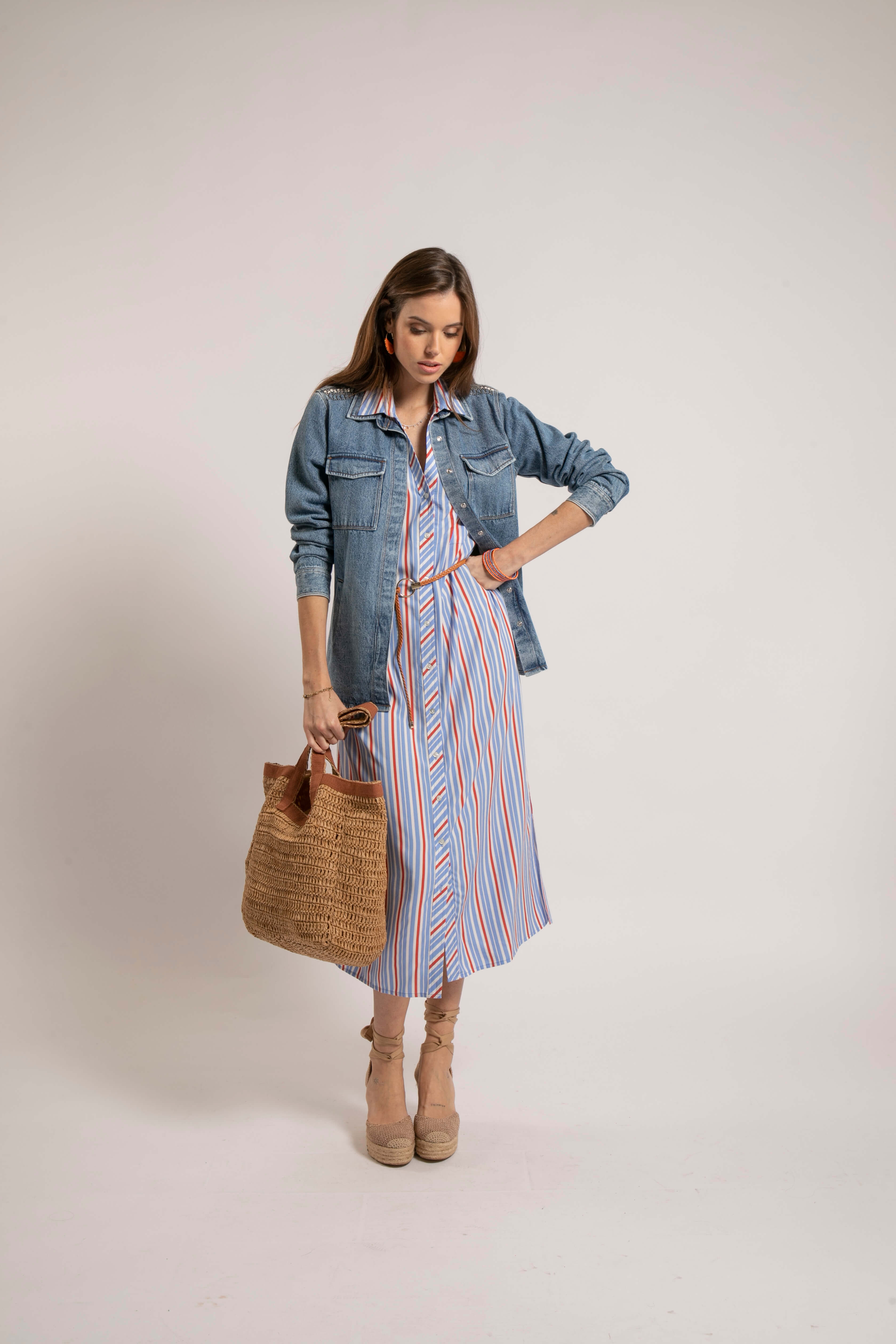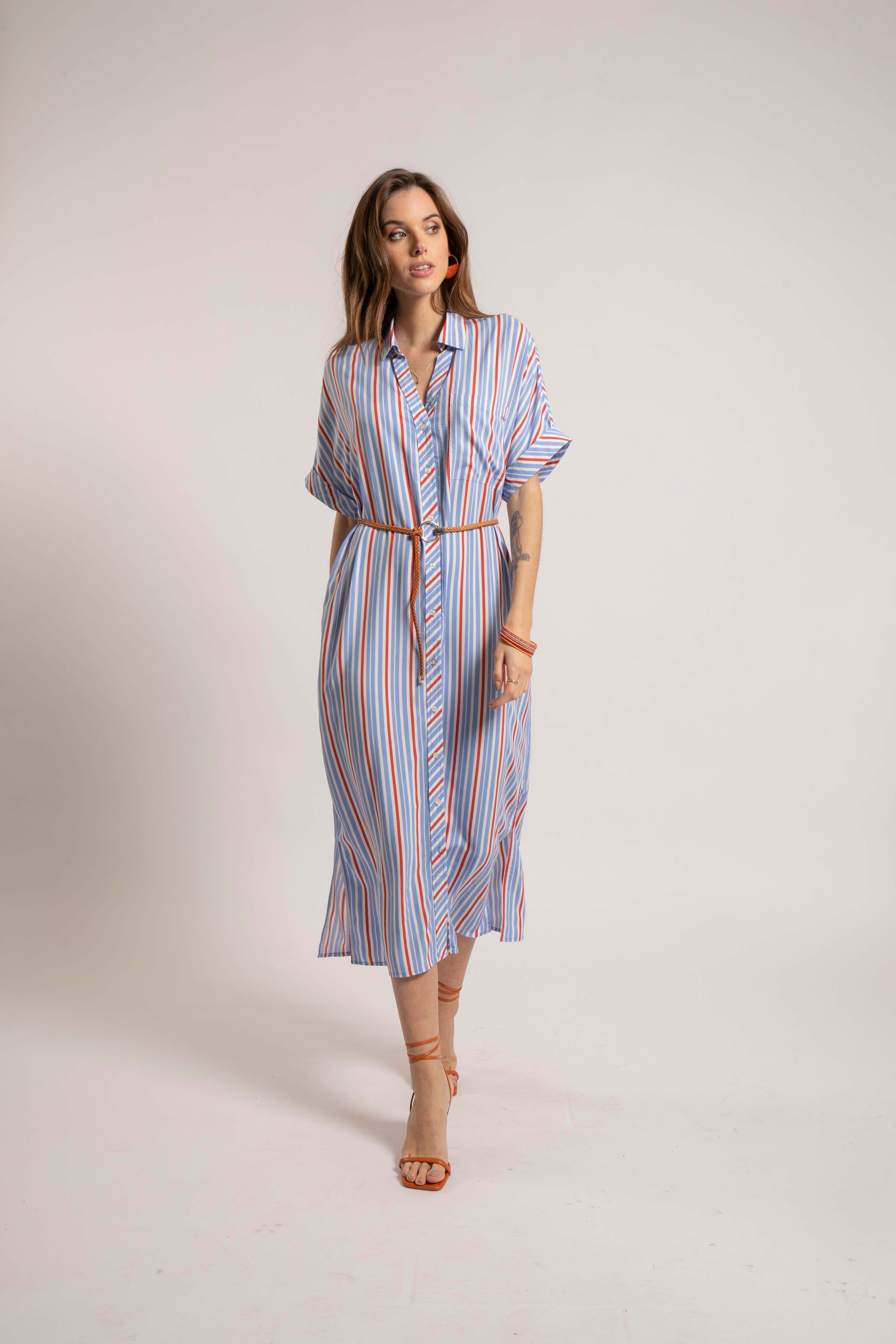 Envie de légereté tout en restant stylée ? Cette saison on mise sur les rayures, que ce soit sur une chemise ou sur une robe, elles vous accompagneront partout ! Alors on shoppe vite cette robe chemise en viscose durable au volume maxi et à l'imprimé rayé bleu et orange pour être stylée au printemps.
