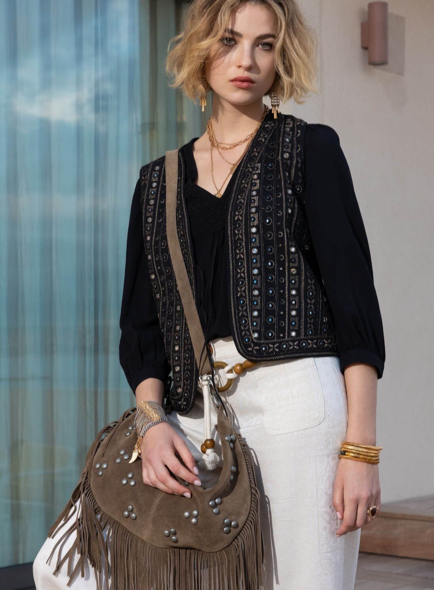 Zwarte gilet met pailletten in gypsy chic stijl