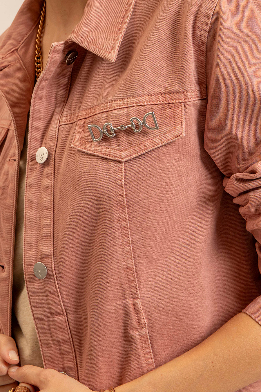Geplooide jas, denim gecertificeerd volgens STANDARD 100 by OEKO-TEX®. 2 sierkleppen op de borst, versierd met een metalen broche. Sluiting met gegraveerde metalen knopen. Overhemdkraag. Lange mouwen met een manchet met knoopsluiting en een puntige afwerking, waarvan één zijde geborduurd is. Speelse deelnaden met dubbele stiksels en 2 zakken in de naad. 2 kleine splitjes aan de zijkant onderaan het kledingstuk.