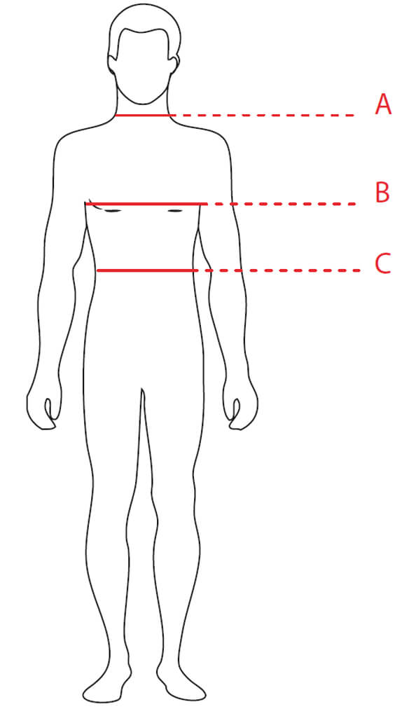 B - Tour de poitrine en cm. | 85/90 | 91/96 | 97/102 | 103/108 | 109/114 | 115/120 | 121/126 |