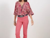 Cette blouse rouge et rose affirme un style audacieux grâce à un imprimé oriental vibrant, imaginé par Elora pour illuminer instantanément la silhouette. Sa coupe blousante offre un tombé fluide et flatteur, tandis que l’encolure en V formée par des panneaux croisés apporte une touche féminine maîtrisée. Les manches 3/4 à revers et le bas smocké structurent l’ensemble avec modernité. Réalisée dans un tissu italien exclusif, elle devient une pièce de caractère, idéale pour dynamiser le vestiaire quotidien.