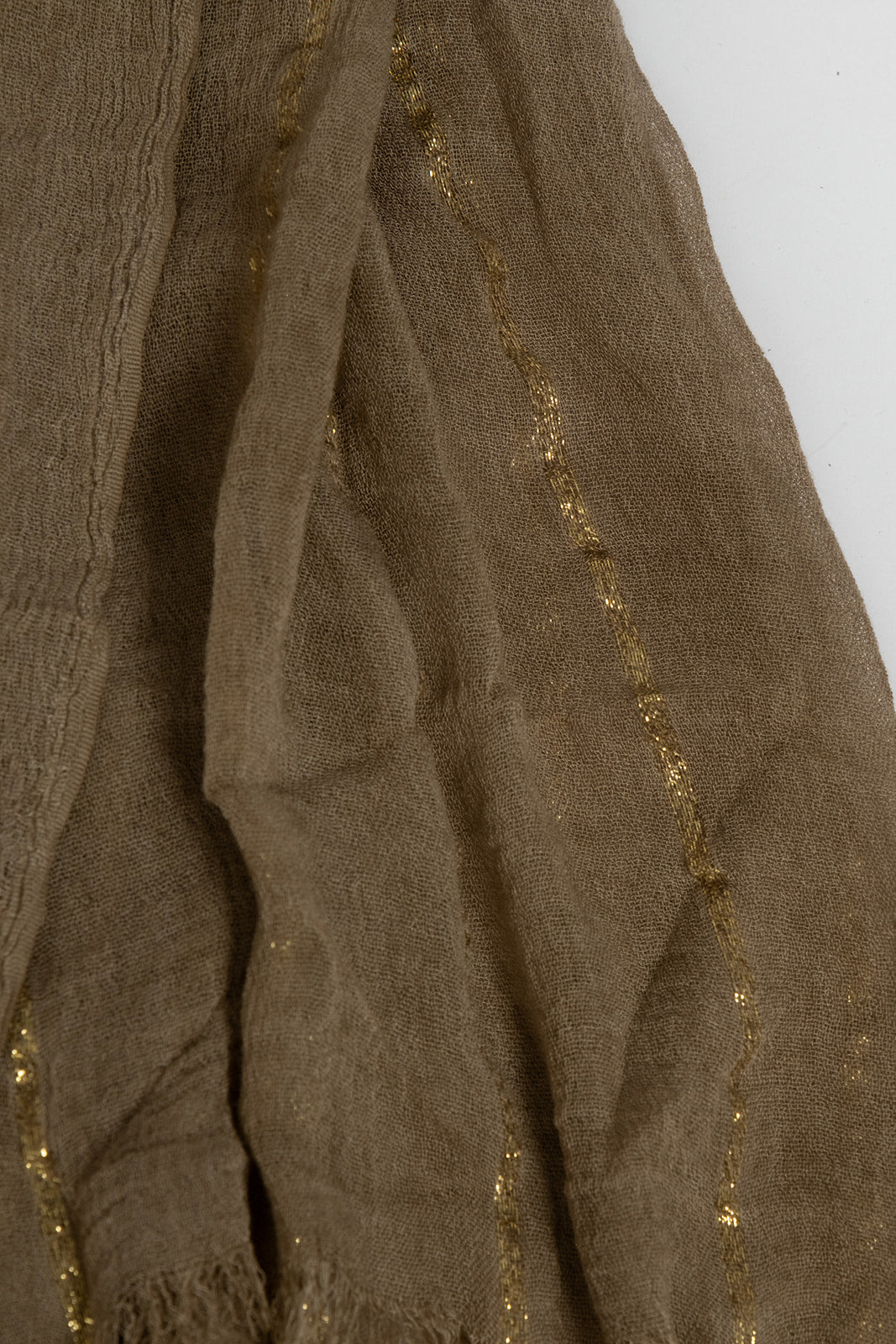 Long rectangle ourlé sur les grands côtés et frangés sur les petits côtés. Coloris beige uni réhaussé de rayures en fils lurex doré.