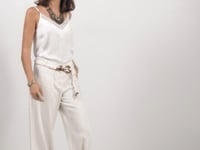 Ce pantalon beige affirme une allure bohème élégante grâce à un tissu jacquard au motif cachemire, imaginé par Elora pour sublimer la silhouette avec douceur. Sa coupe fluide à bas large accompagne le mouvement et allonge la jambe jusqu’à la cheville. La ceinture corde amovible structure la taille tout en apportant une touche naturelle. Les poches plaquées et le bouton bijou renforcent son esprit soigné. Une pièce forte et tendance, idéale pour un vestiaire féminin chic et décontracté.