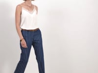 Ce pantalon bleu foncé affirme une allure élégante et solaire grâce à un tissu indigo subtilement rayé, imaginé par Elora pour accompagner une working girl libre et assurée. Sa coupe fluide à bas légèrement évasé allonge la silhouette avec naturel, tandis que la taille élastiquée au dos assure un confort optimal. Les poches soignées et les finitions pensées pour les associations claires renforcent son esprit chic. Une pièce moderne et féminine, idéale pour conjuguer style et assurance au quotidien.