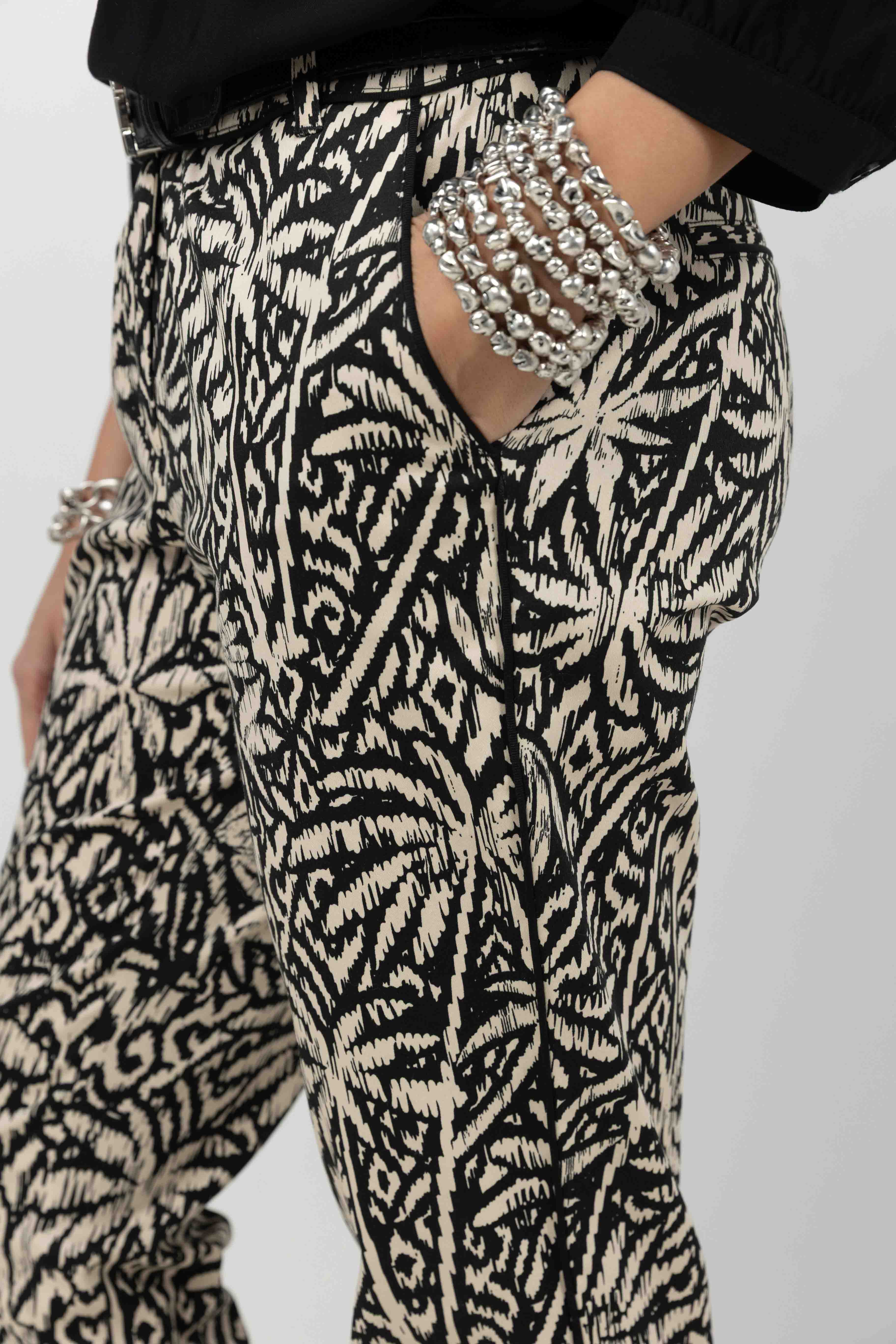 Ce pantalon imprimé écru et noir affirme un style audacieux grâce à un motif graphique exclusif, imaginé par Elora pour dynamiser instantanément la silhouette. Sa coupe cigarette élance la jambe avec précision, tandis que les passepoils noirs soulignent les lignes et apportent une touche rock assumée. Le tissu stretch assure confort et maintien tout au long de la journée. Chic et affirmé, il devient une pièce forte du vestiaire féminin, idéale pour composer des looks modernes et pleins de caractère.