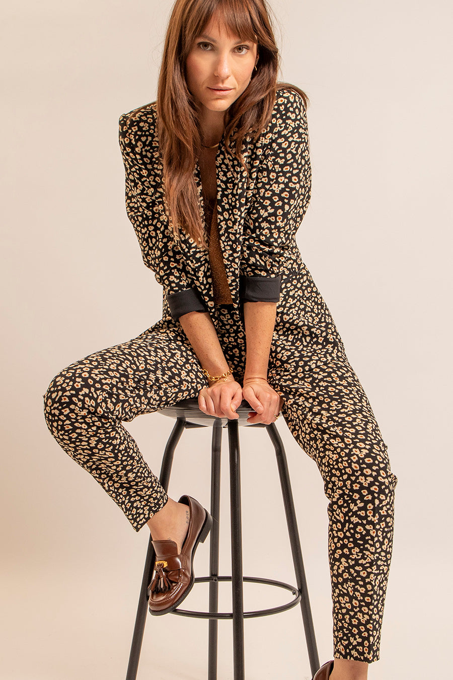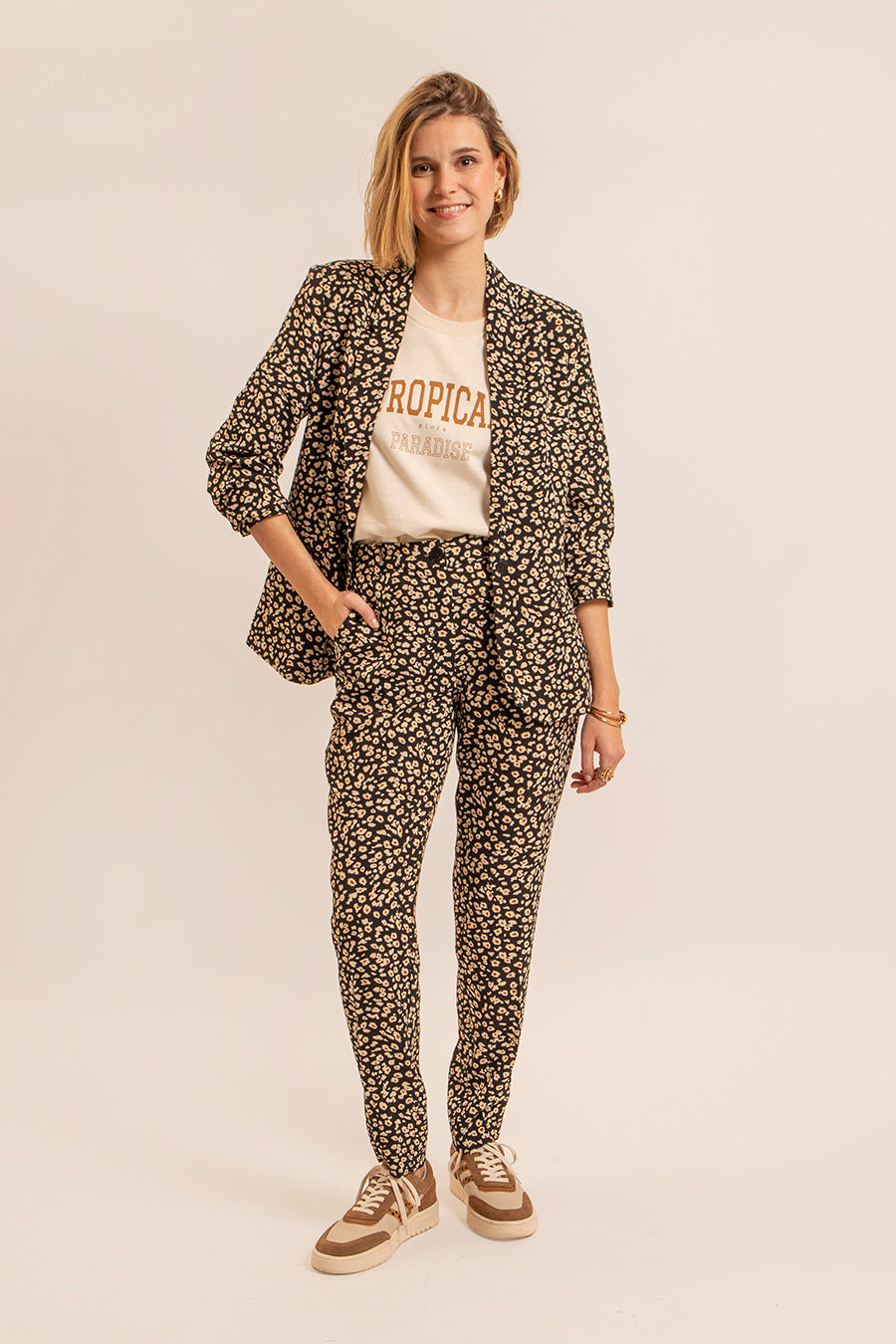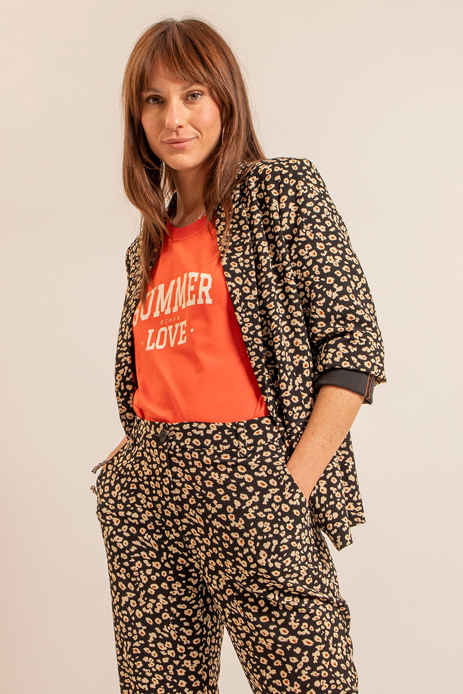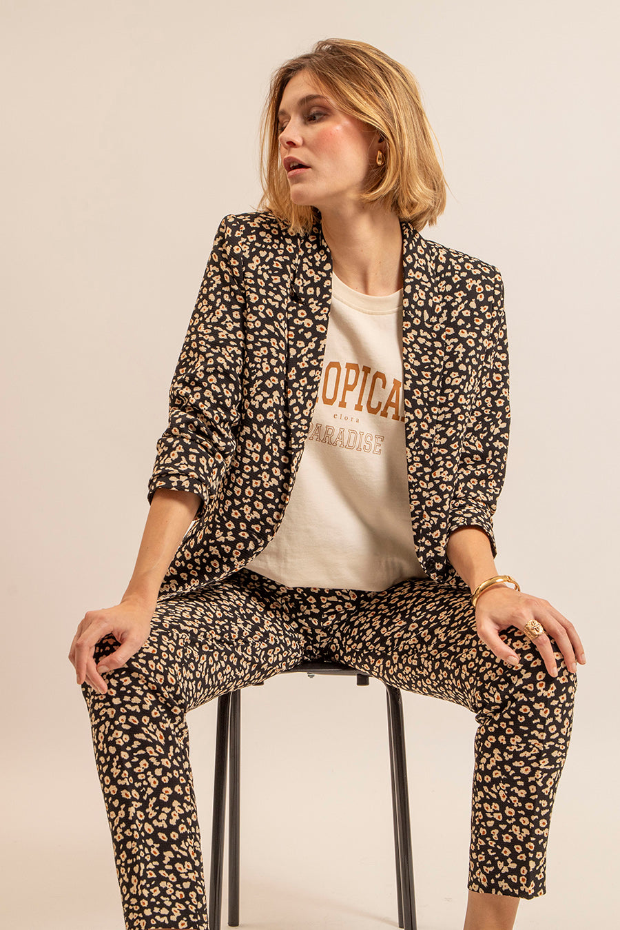 La matière "bubble" fluide et infroissable et l'imprimé léopard revisité version florale. En total look avec le pantalon coordonné ou sur un pantalon uni, allie confort et chic.